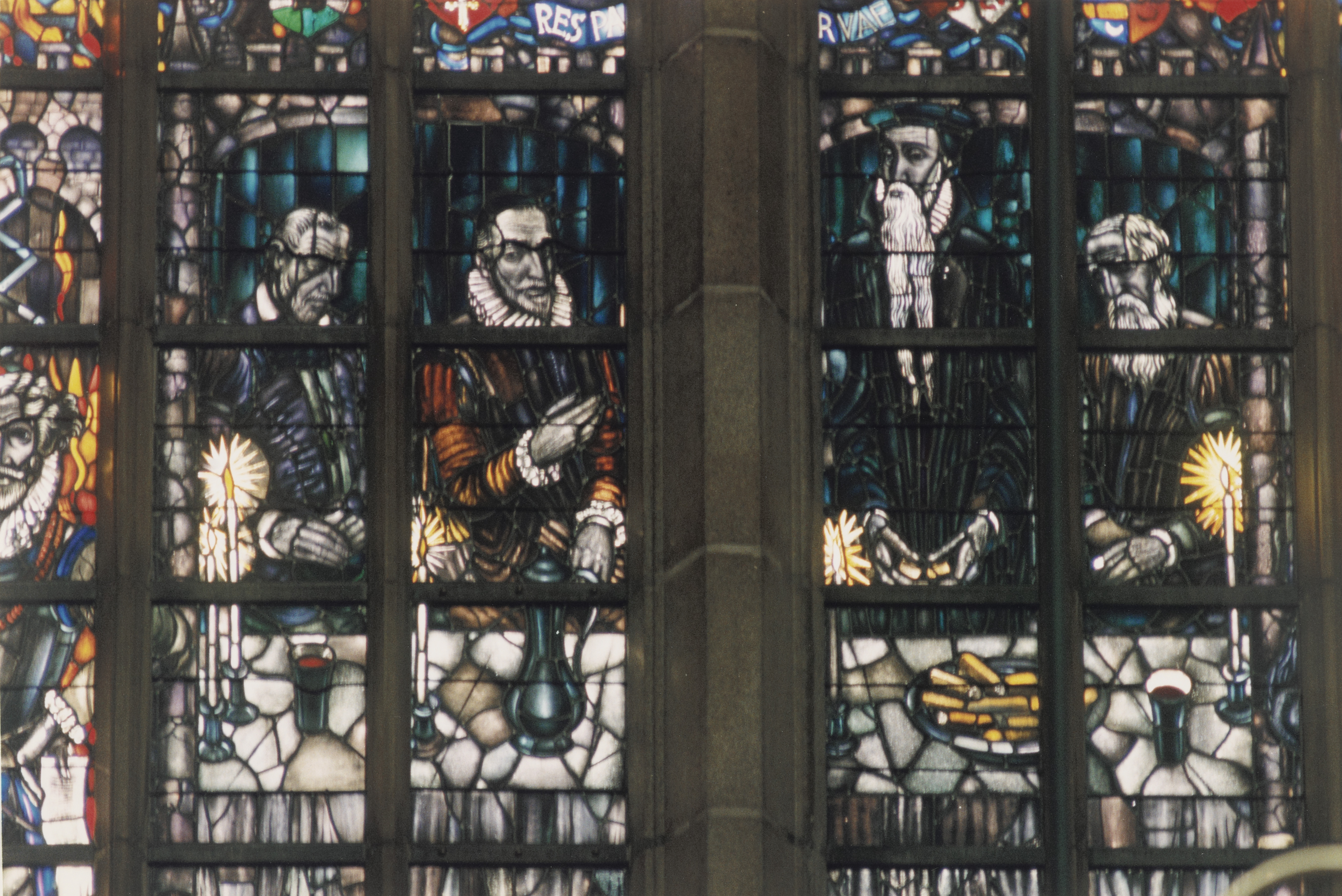 - Het raam beeldt 5 geschiedenissen uit: de bevrijding van Dordrecht in 1572, Willem van Oranje aan het heilig avondmaal, Statenvergadering 1572, Synode 1618/19 en de bijbelvertaling.