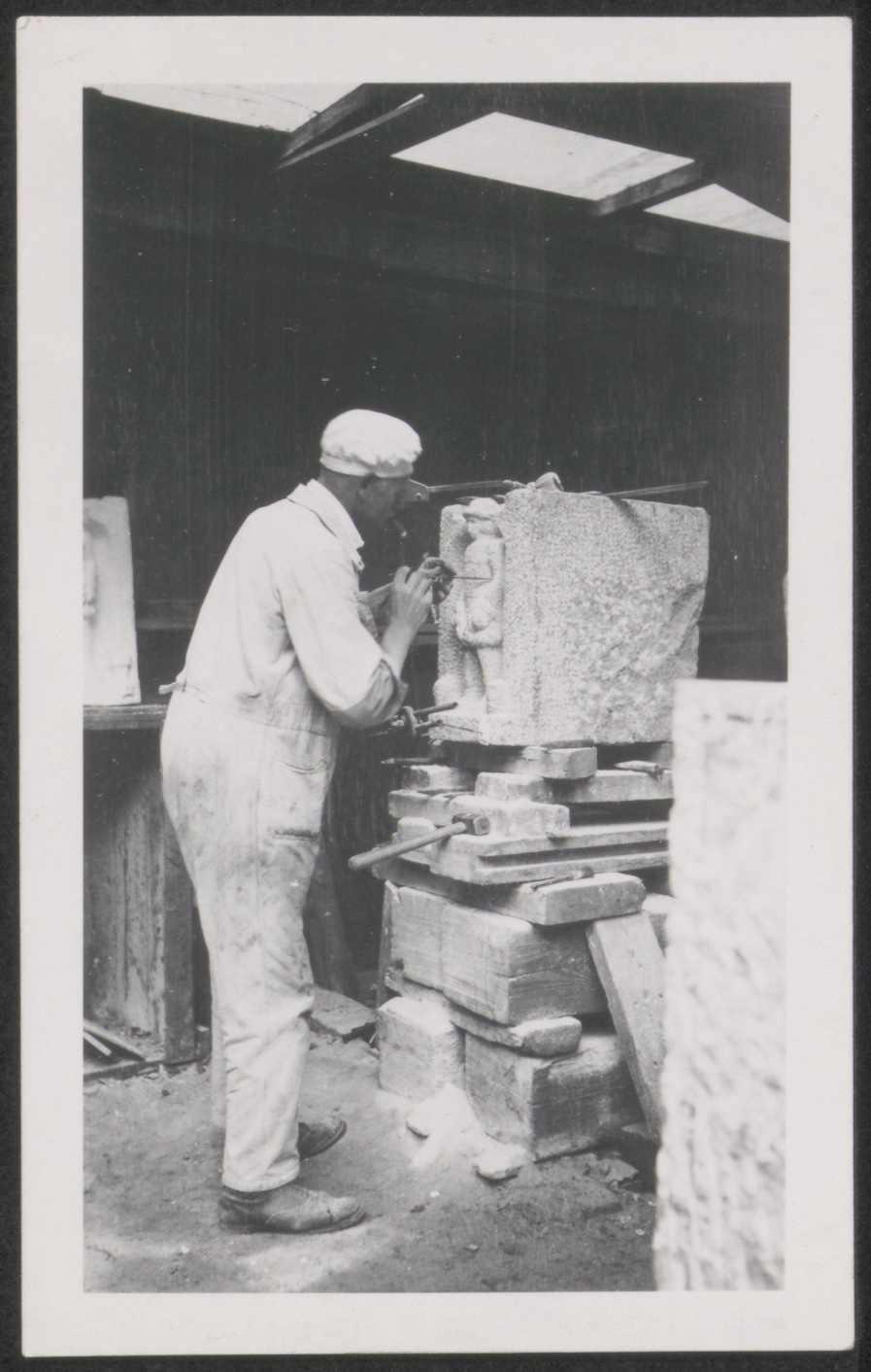 Vervaardiging van een van de beelden door een medewerker van beeldhouwer Hildo Krop ter …