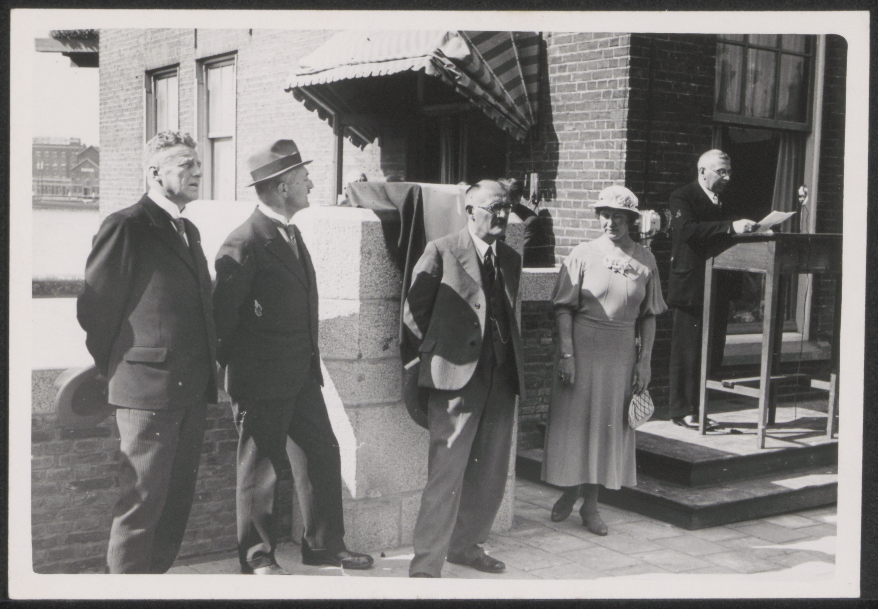 - Wethouder Van Huiden houdt een rede bij de opening van de vernieuwde Leuvebrug. V.l.n.r. burgemeester Bleeker, secretaris Poll, wethouders Dicke en Smit-Pieters, die een der beeldhouwstukken van Hildok zal onthullen.