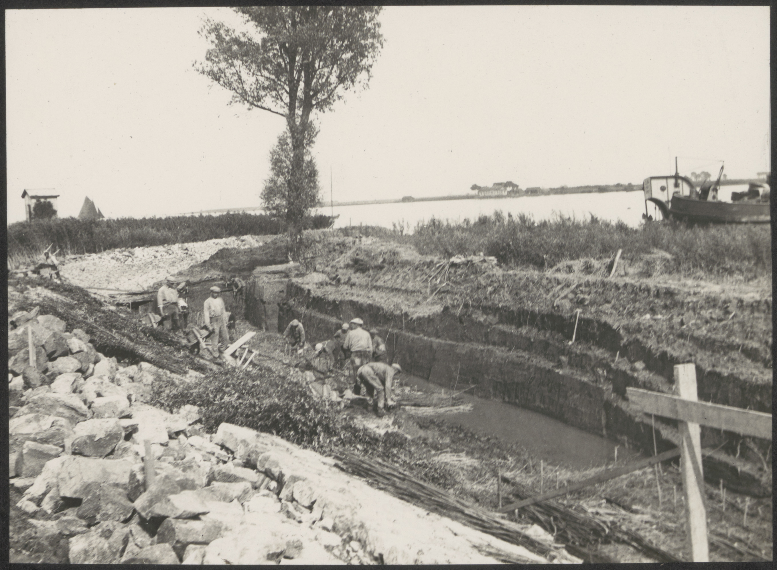 - Versterking van de oever langs de Zeedijk bij de Kop van 't Land. Links het waterpeilhuisje.