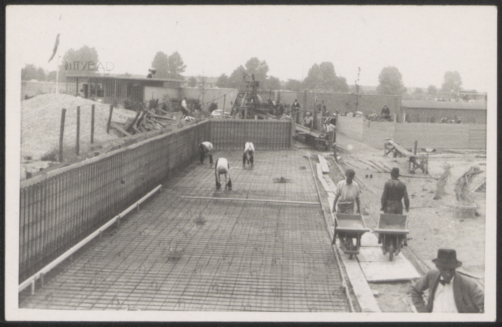 - arbeiders / werklieden bouwwerkzaamheden kruiwagens zwembaden