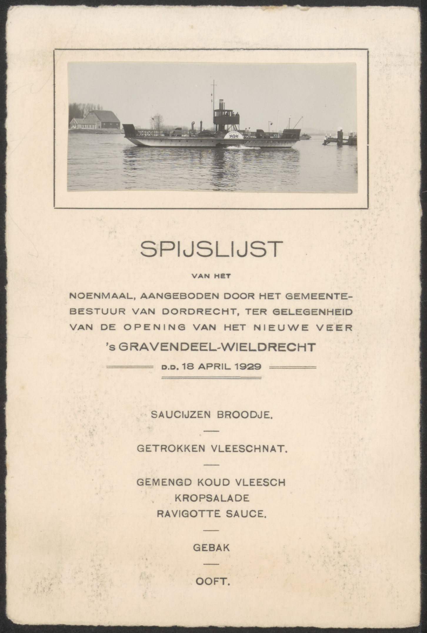 - Menukaart voor genodigden bij de opening van het vernieuwde veer Wieldrecht - 's-Gravendeel.