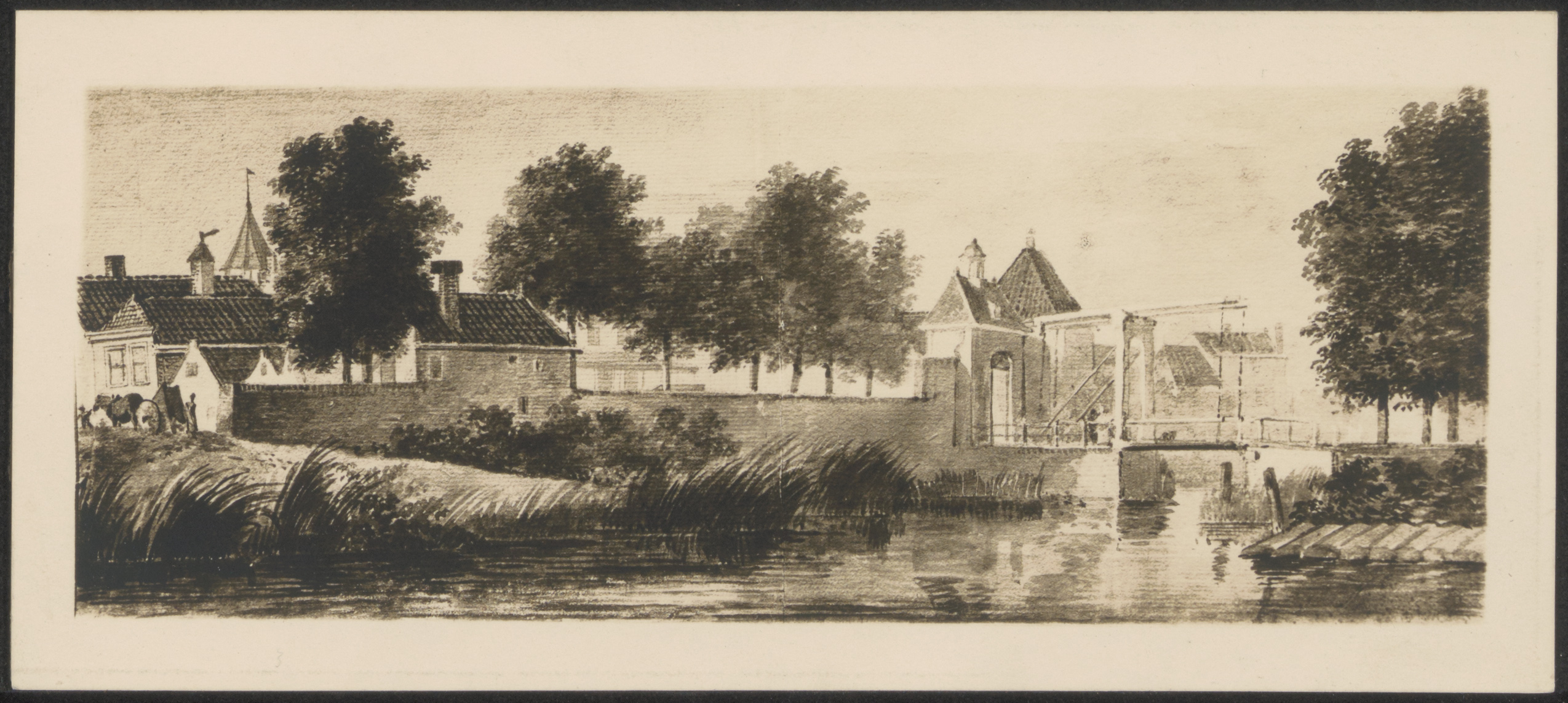 - Tekening van de Vriesepoort en Vriesebrug en bebouwing aan de Vest langs de Spuihaven.