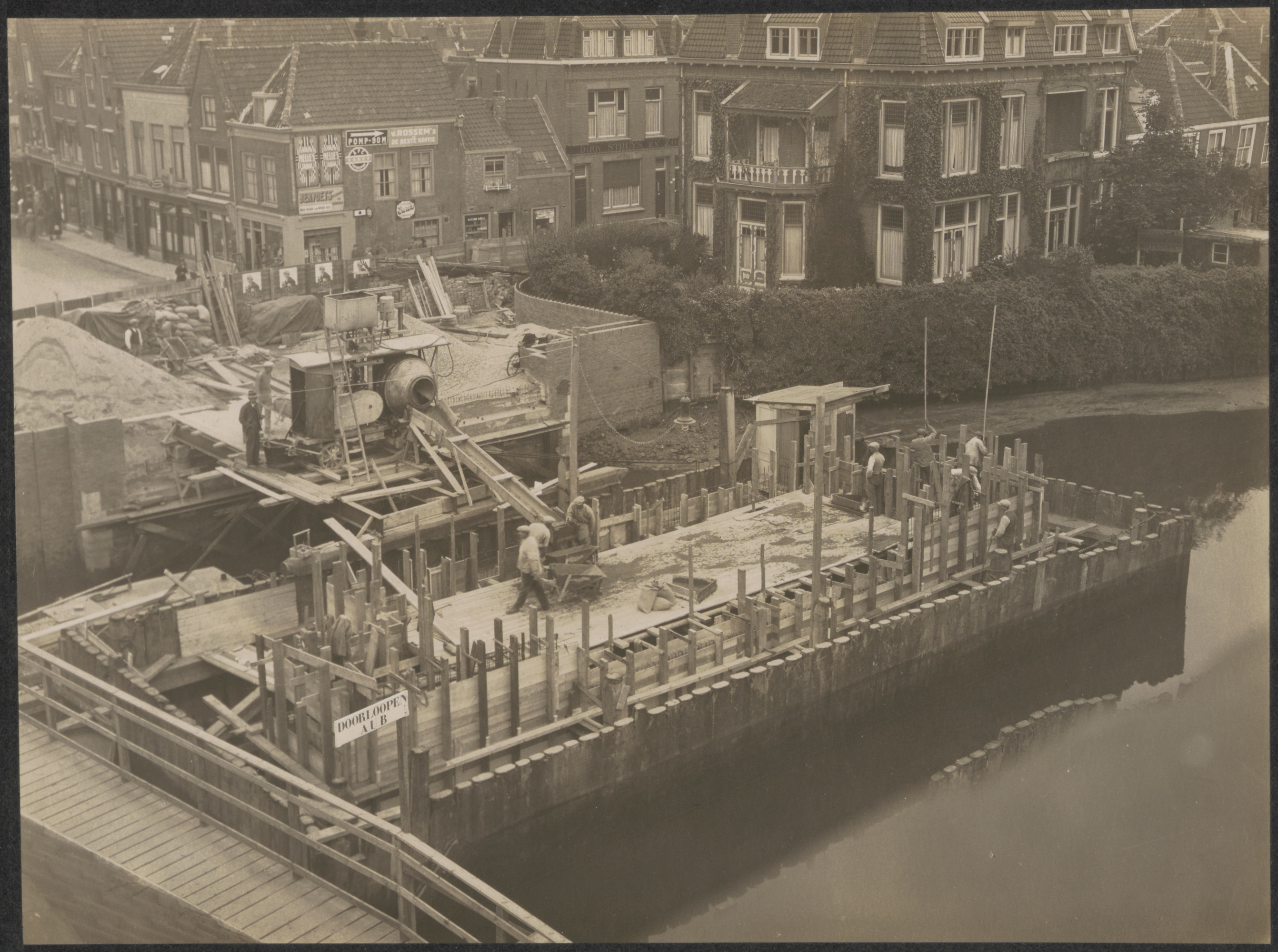 Bouw Vriesebrug ca.1932 waar Argelo de architect van was. Links de tijdelijke noodbrug. Rechts boven de huizen aan de Vest.
