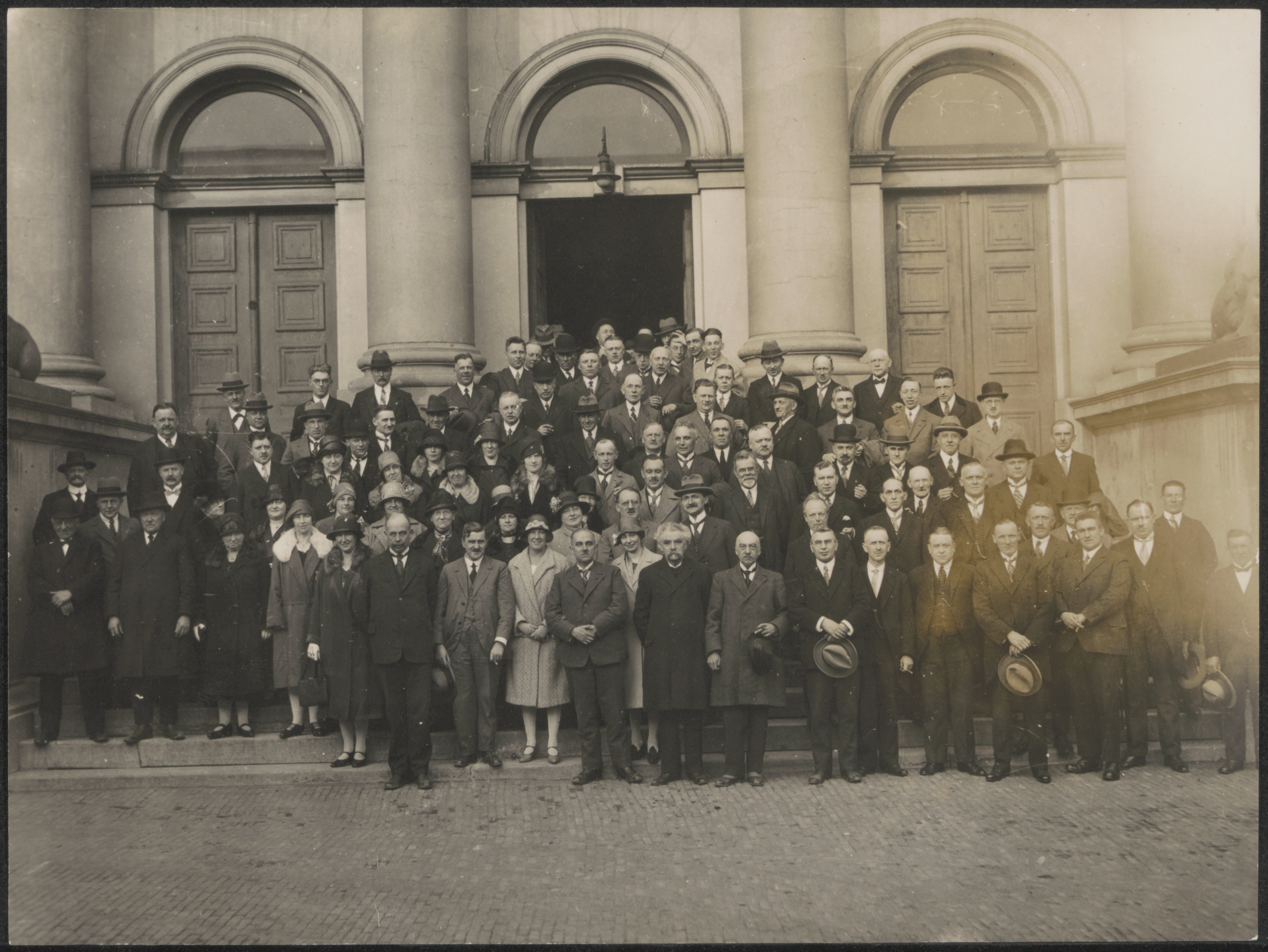 Gezelschap op de trappen van het stadhuis van Dordrecht.