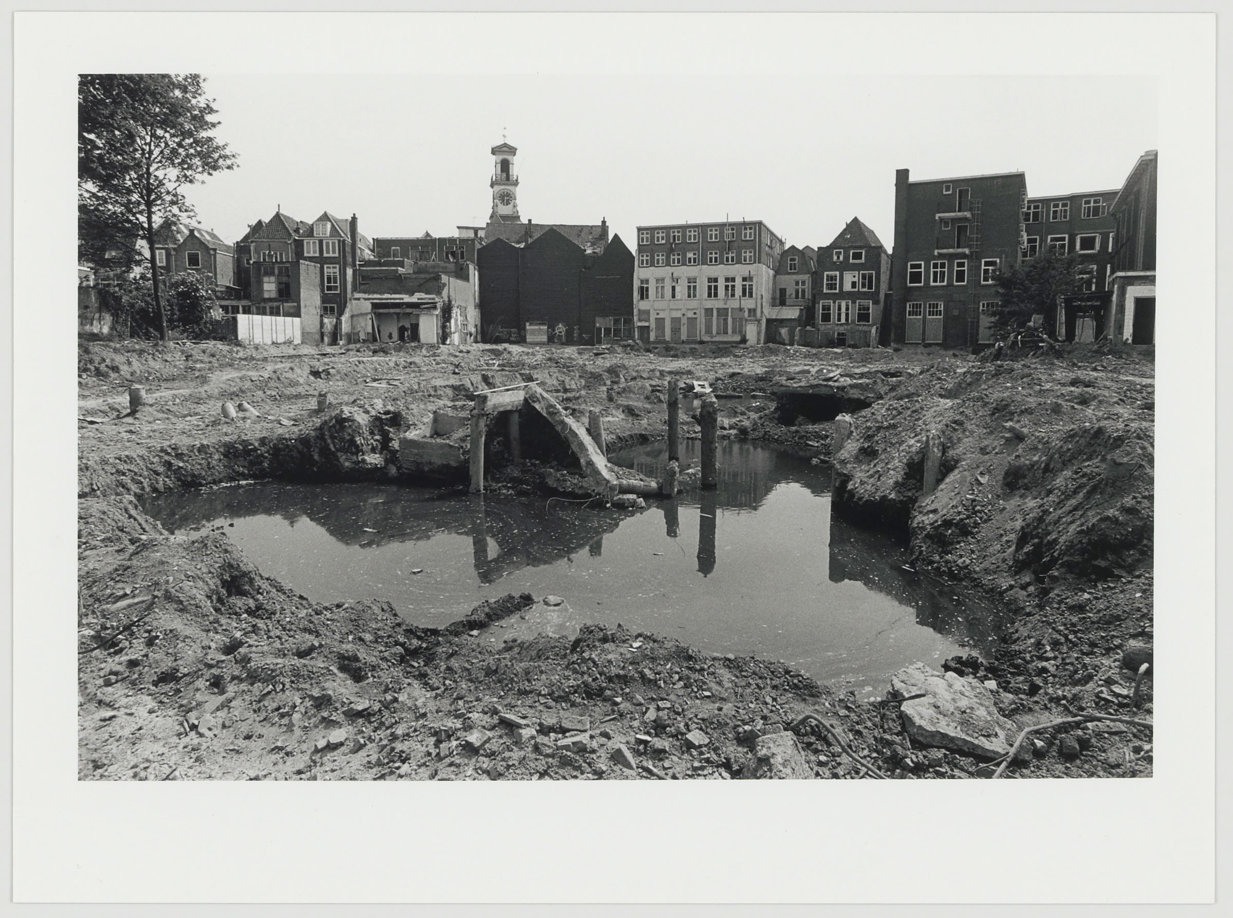 - Braakliggend terrein van het gesloopte RK Ziekenhuis aan de Houttuinen, gezien naar de achtergevels van panden in de Grotekerksbuurt en de toren van het stadhuis.