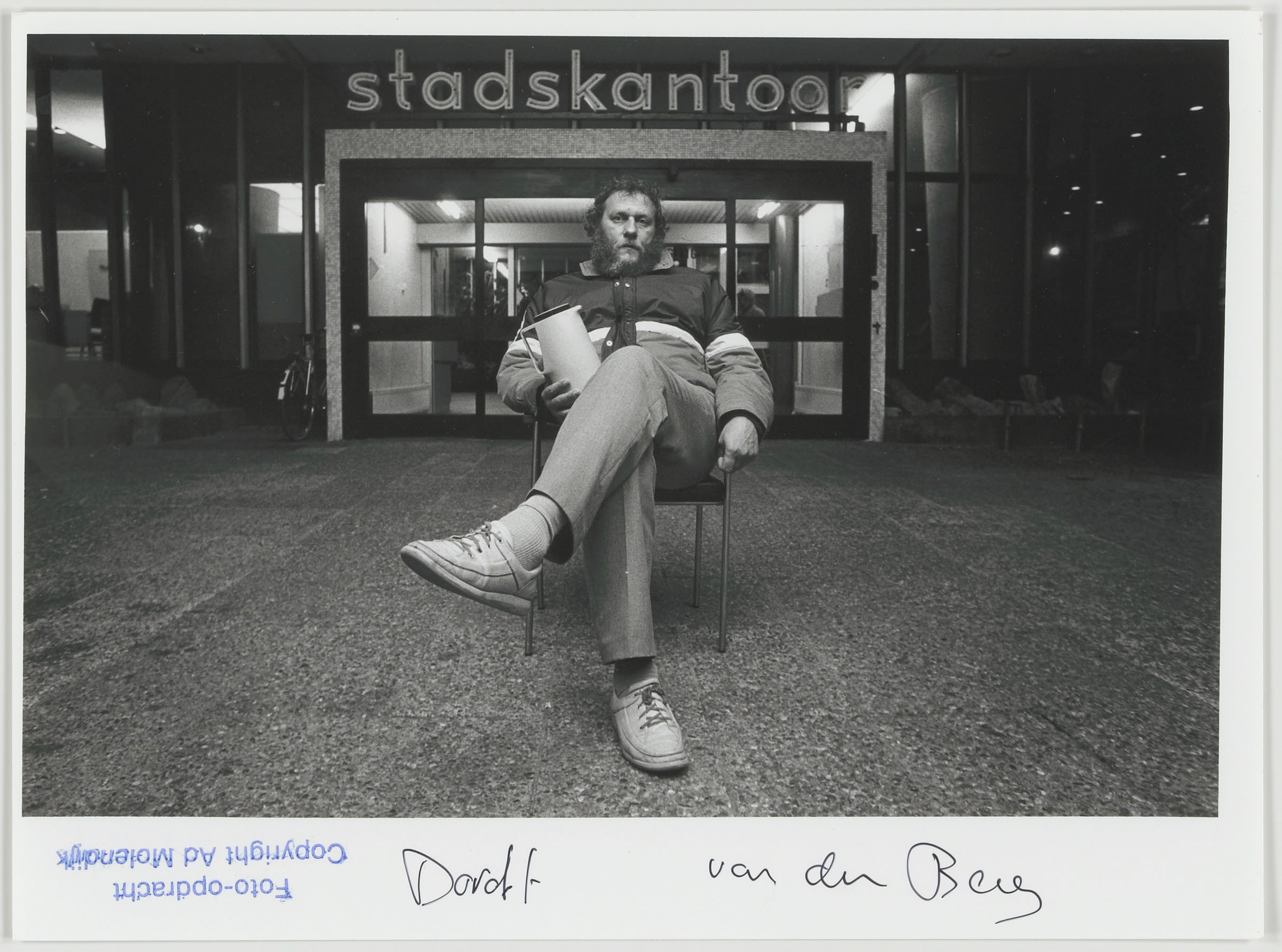 - Protesterende burger (?) houdt zitactie voor het stadskantoor.
