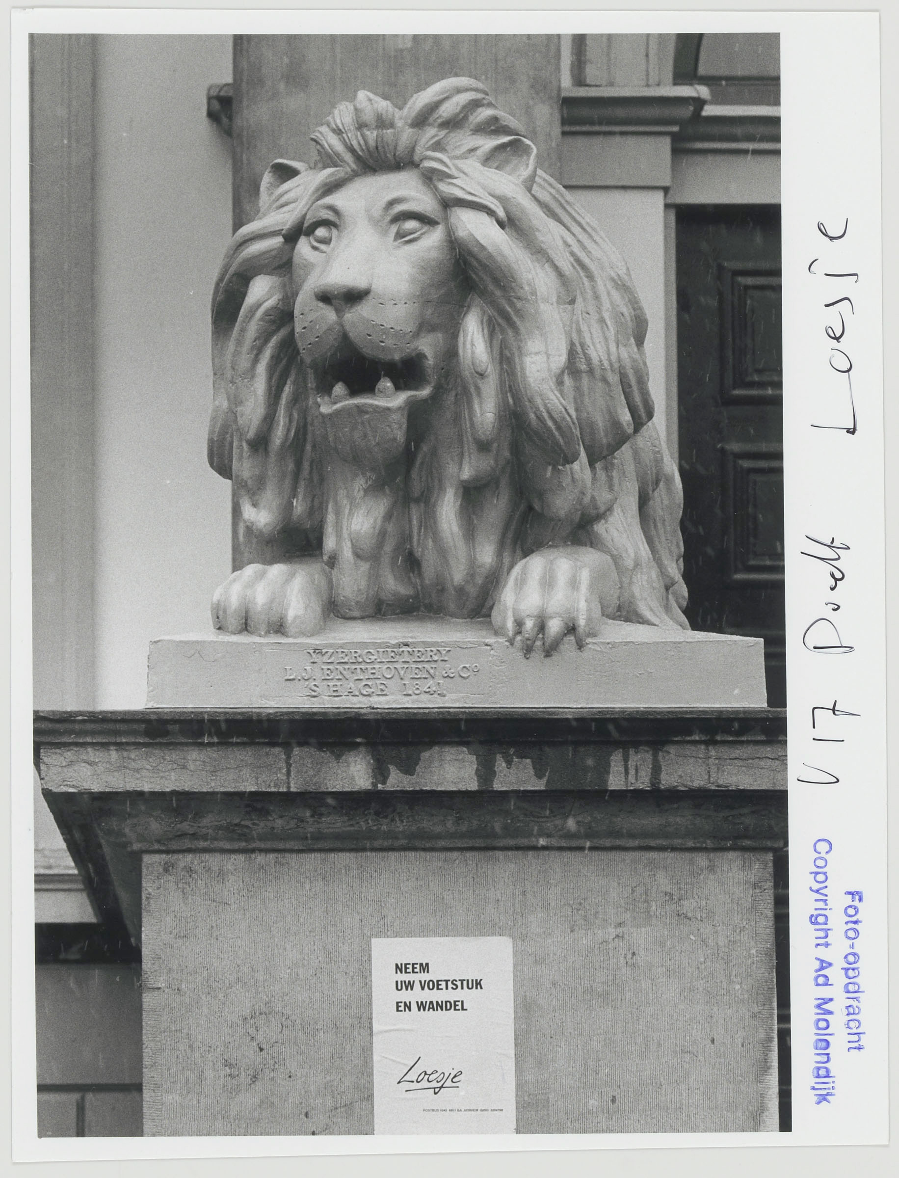 - Poster van Loesje op het voetstuk van de leeuw voor het stadhuis.