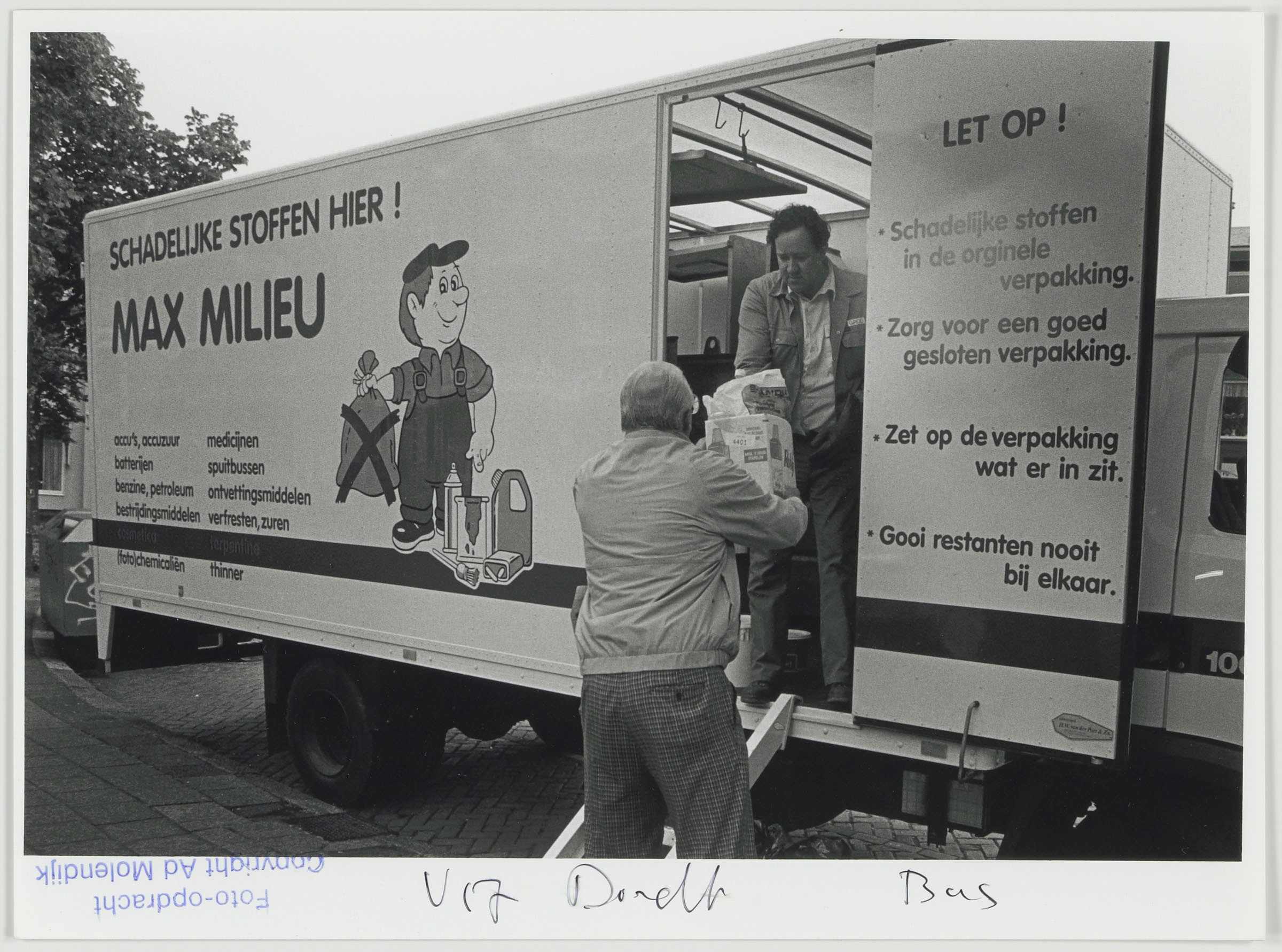 - Kees Tilgenkamp op de bus van Max Milieu voor het gescheiden inzamelen van enkele soorten (chemisch) afval.
