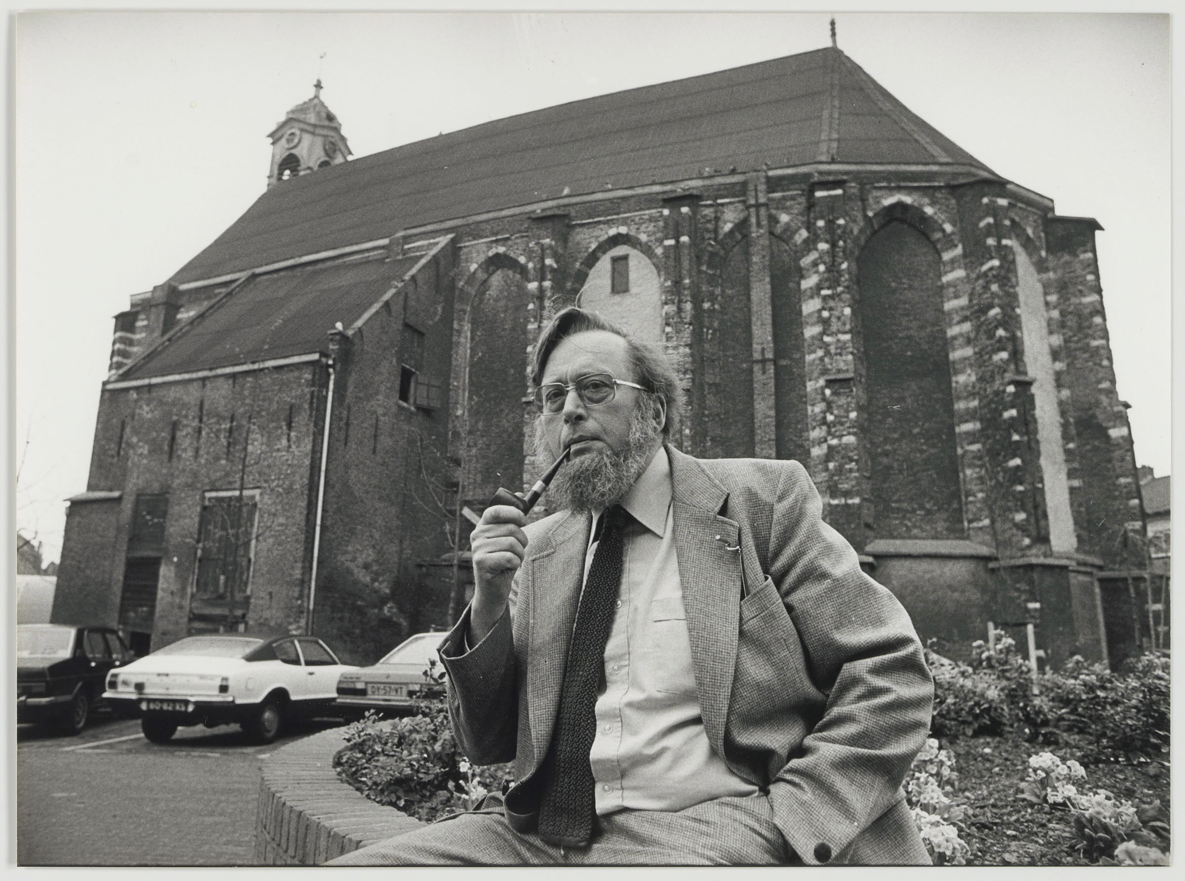 Gemeentearchivaris dr. Th.W. Jensma bij de Nieuwkerk op het Nieuwkerksplein.