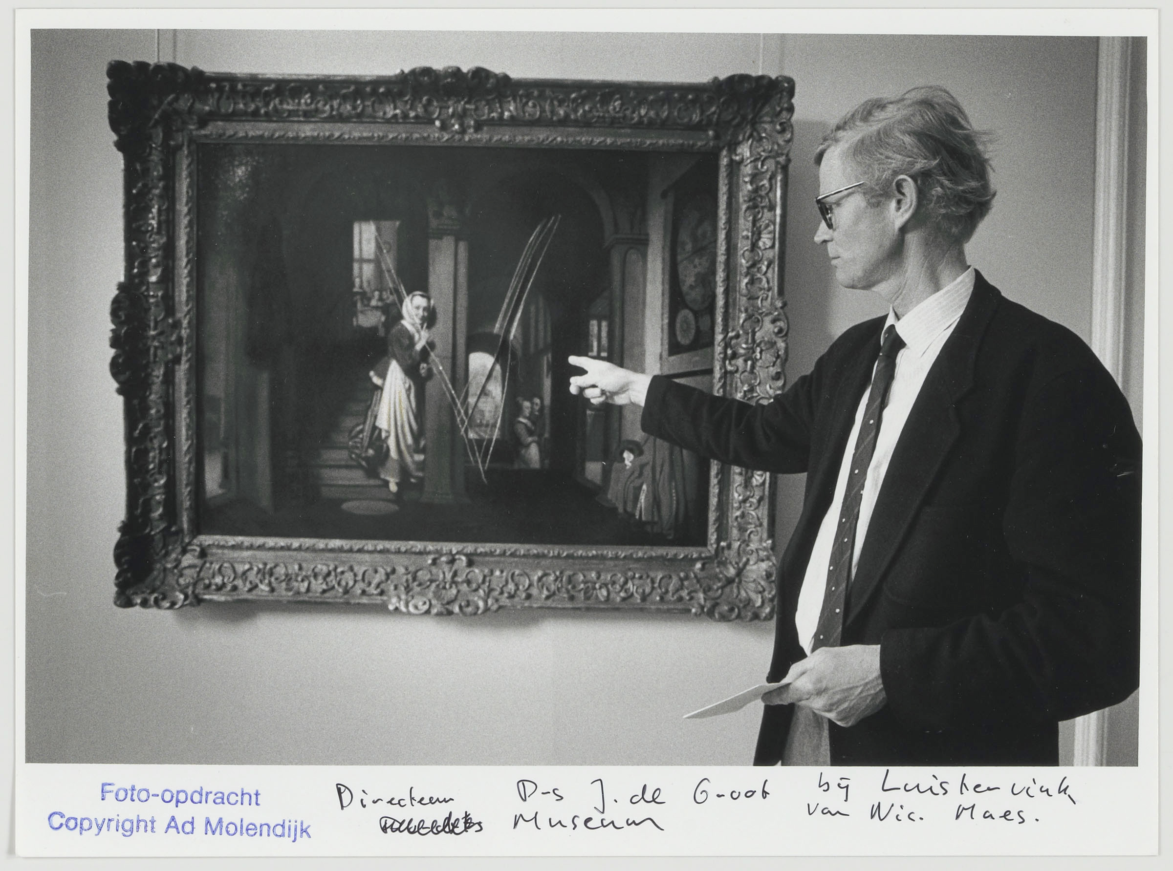 - Directeur Drs. J. de Groot bij het schilderij De Luistervink van Nicolaas Maes in het Dordrechts Musuem in de Museumstraat.