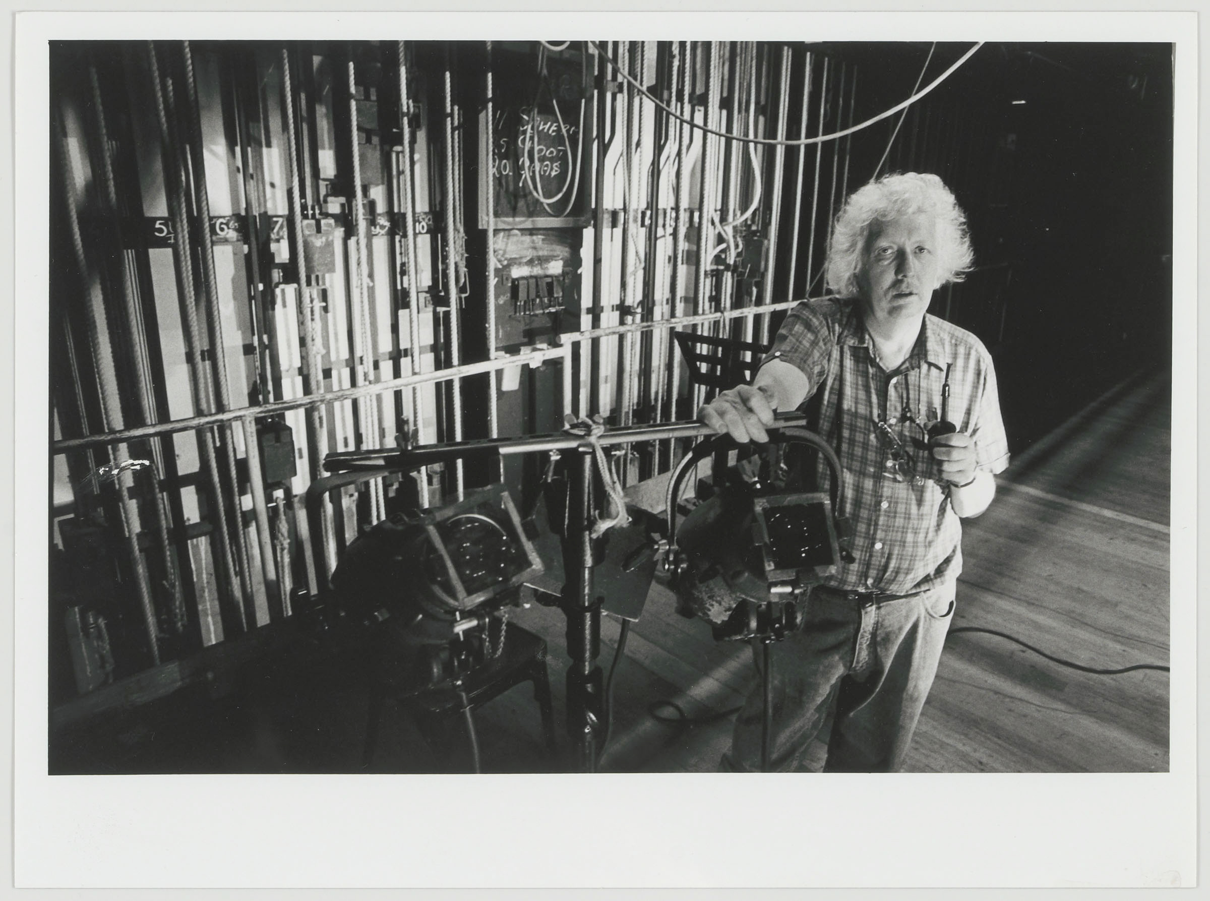 - Toneelmeester Ton van Krieken bij de trekken aan de zijkant van het podium van de grote zaal in schouwburg Kunstmin.
