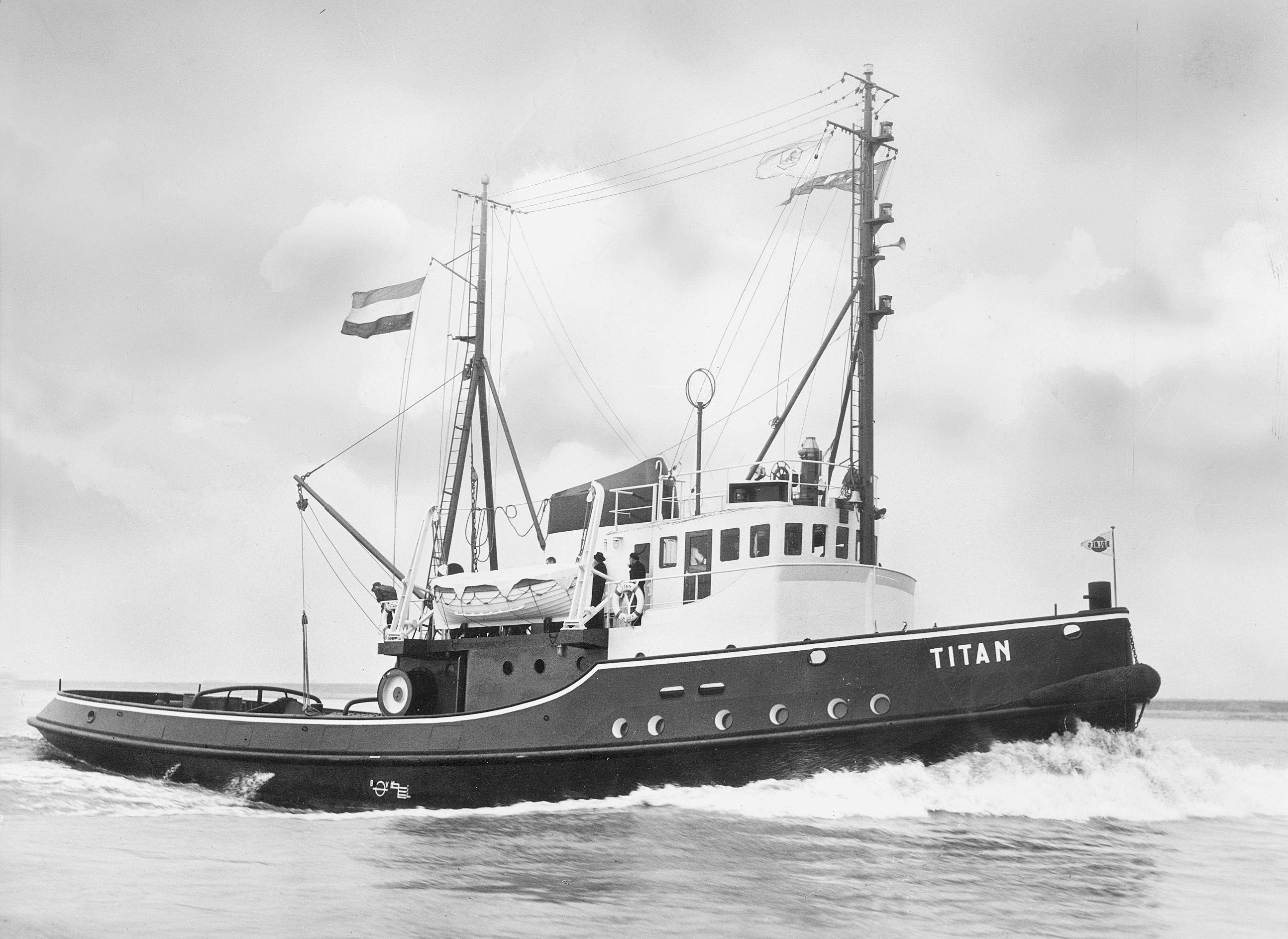1956 - 1983 NV Bureau Wijsmuller - IJmuiden Launched 29-10-1955; delivered 19-03-1956 by Scheepswerf-, Gashouder- en Ketelbouw v/h Jonker & Stans - Hendrik ido Ambacht (276) 31,98 x 29,60 x 8,23 x 4,20 x 3,56 m 245 grt P.H.D.Z. 34403/5362192 Lloyds Register 2x 2SA 8 cylinder Bolnes, 190x350; in 1970 engines upgraded 1.200 bhp; after 1970, 2.150 bhp 11,75 knots 18 tons BP; after 1970, 25 tons Newbuilding Sold In 1983 renamed TITAN A by Illman Jones - Oakland In 1987 as TITAN A to Levine Shipping Ltd.- Gibraltar. In 1992 as TITAN A to Sorek Services Ltd. - Gibraltar. In 1993 back to Levine Shipping Ltd.- Gibraltar. In 2005 as TITAN A seen near Papeete, Clipperton Eiland