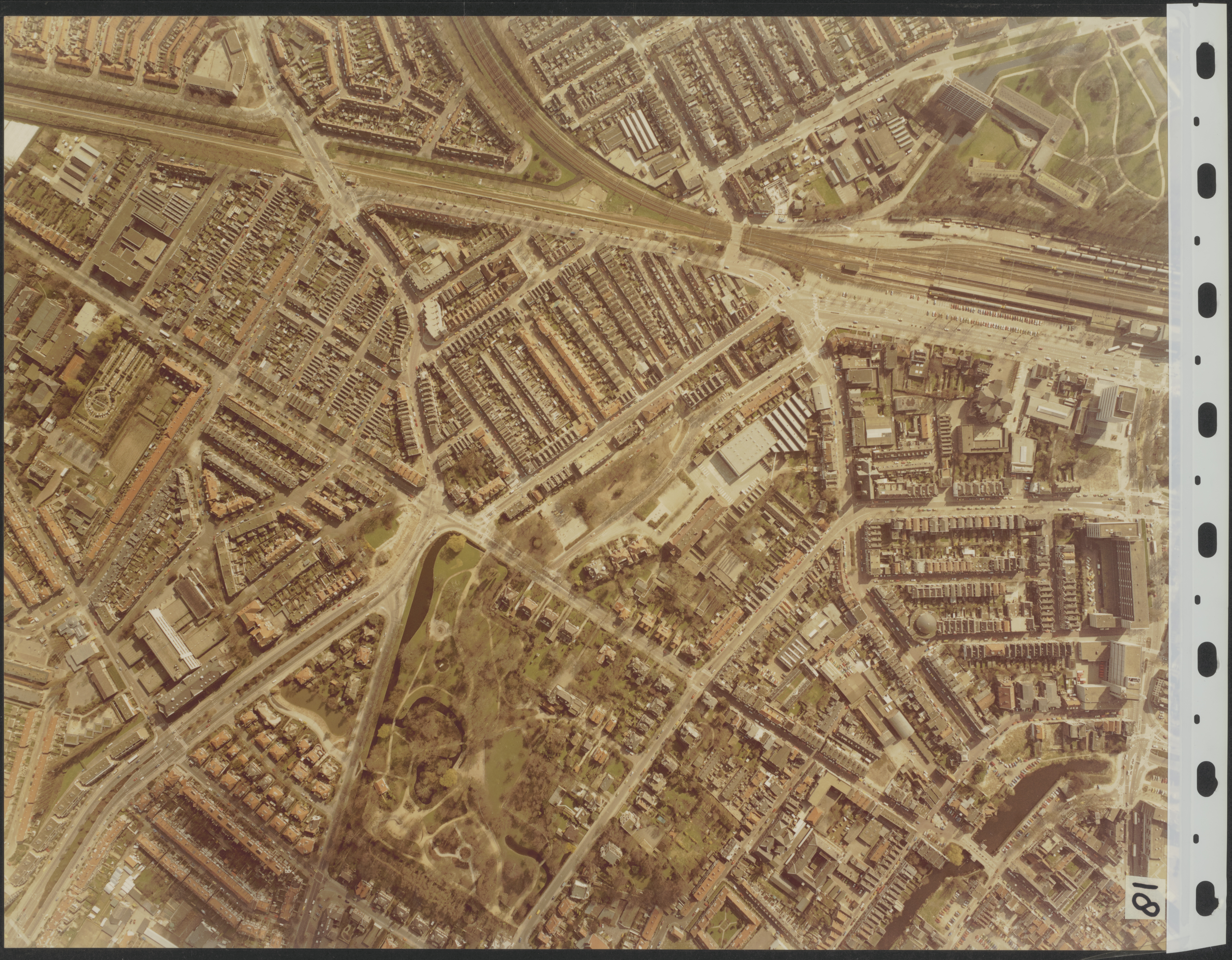 - Luchtfoto van Park Merwestein (onder) richting Crayenseynstraat (linksboven). Rechtsboven het Weizigtpark, daaronder het station en het Tomadohuis.