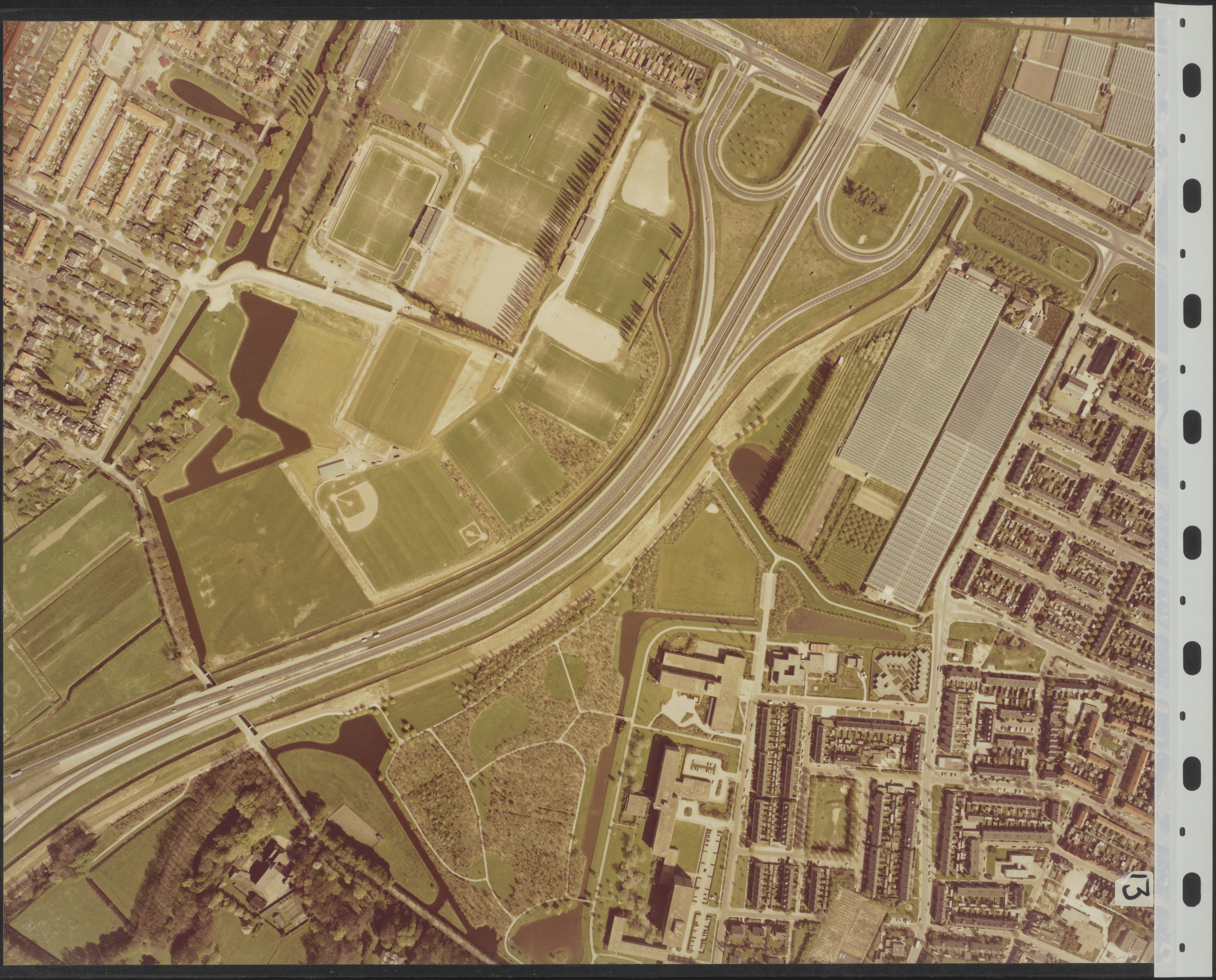 Luchtfoto van de Rondweg N3 bij het Land van Valk en de DFC-terreinen (linksboven). …