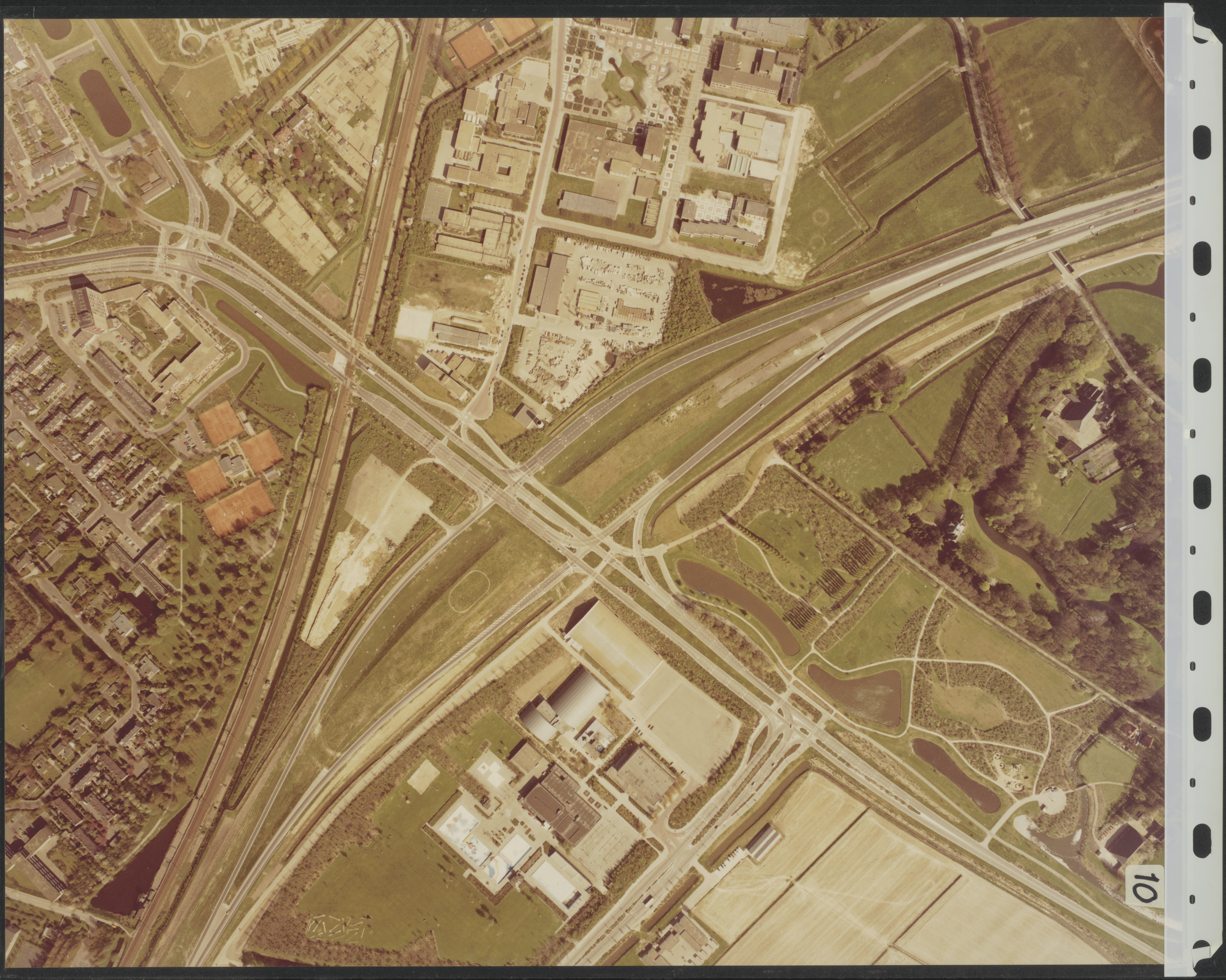 Luchtfoto van de spoorlijn naar Breda bij de Laan der Verenigde Naties. Linksboven de …