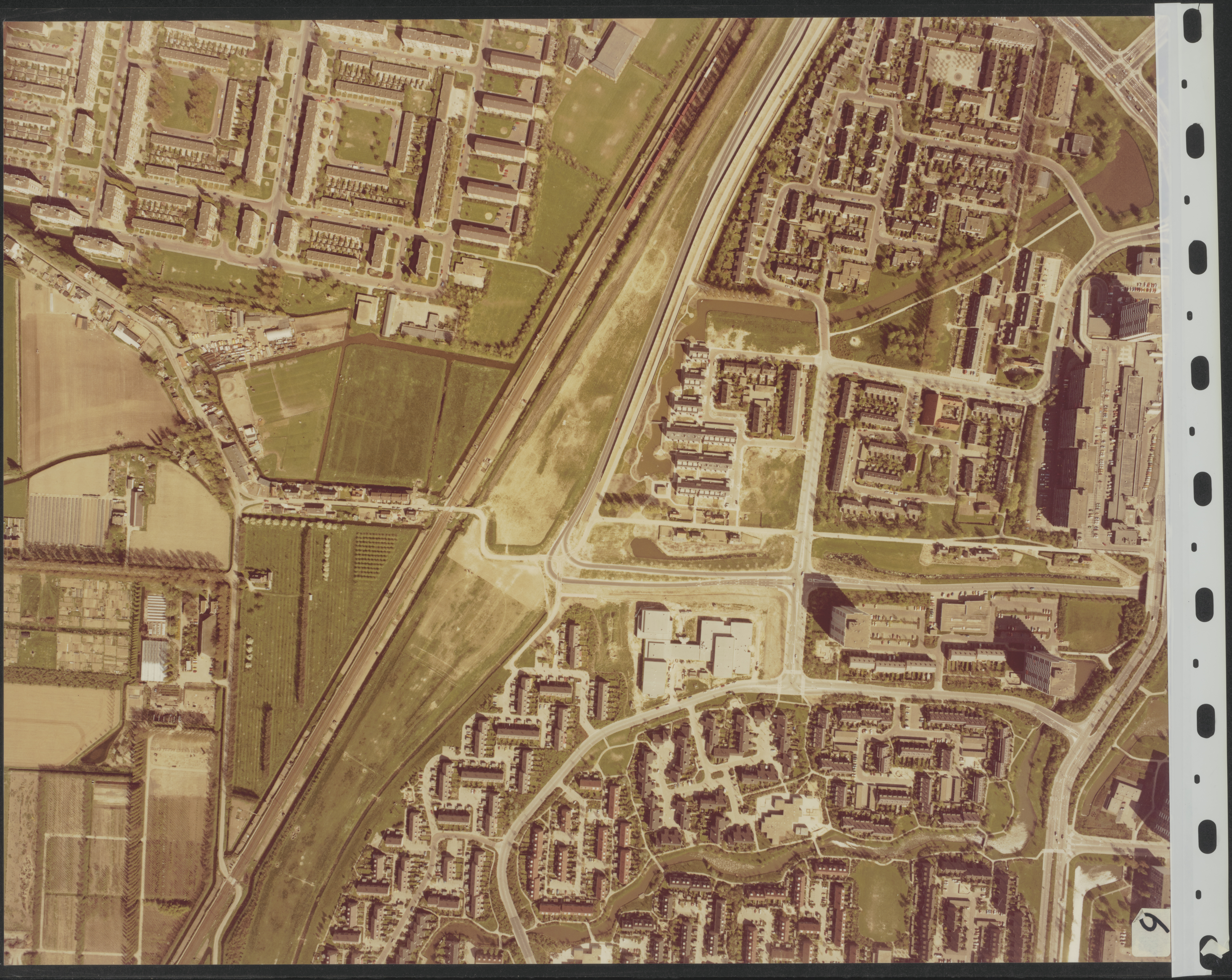 - Luchtfoto van de spoorbaan naar Breda tussen het zuidoostelijk deel van Crabbehof (linksboven) en het zuidwestelijk deel van Sterrenburg. Rechts van de spoorbaan ligt de Rondweg N3.