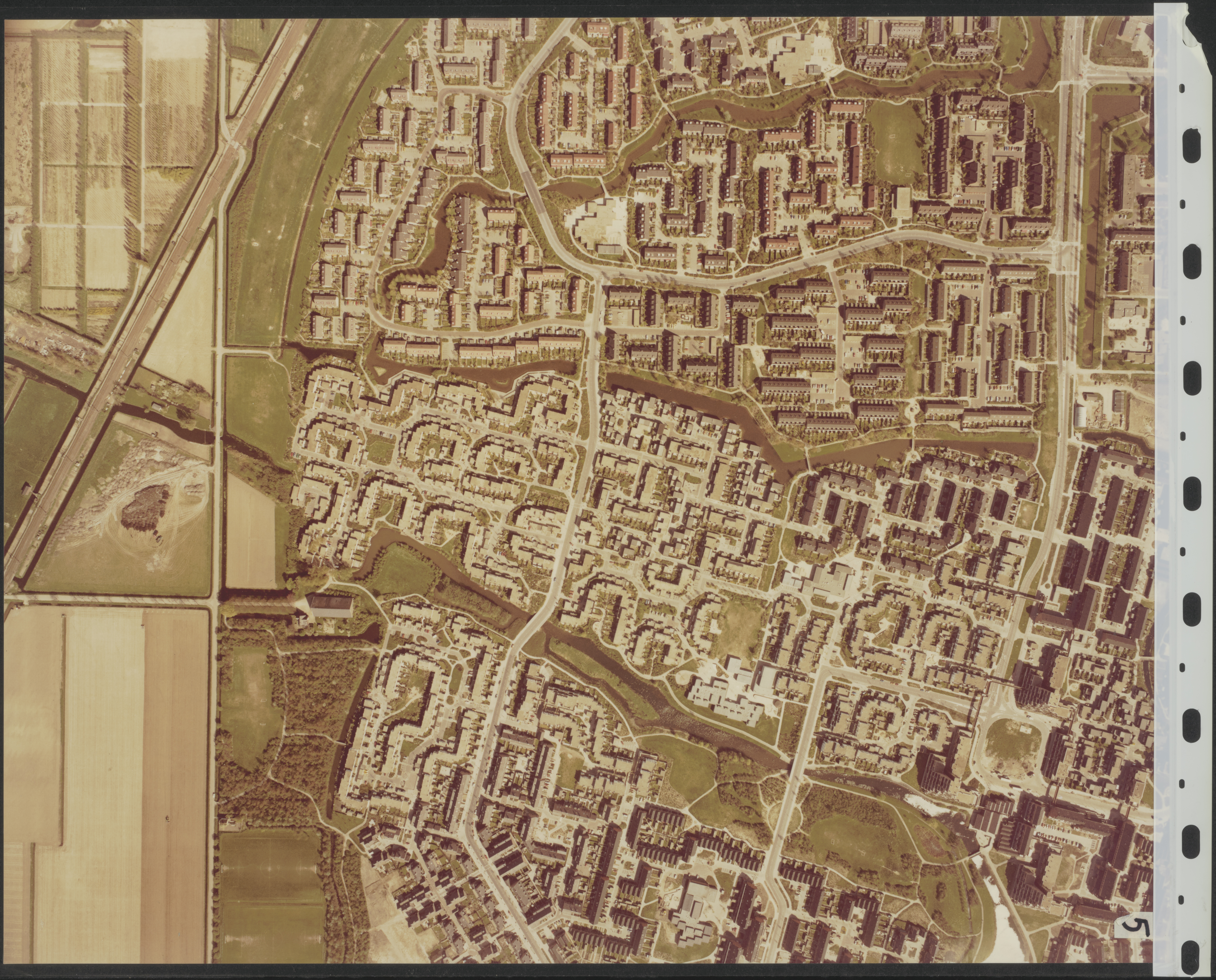 Linksboven de spoorlijn en een stukje rondweg in aanleg.