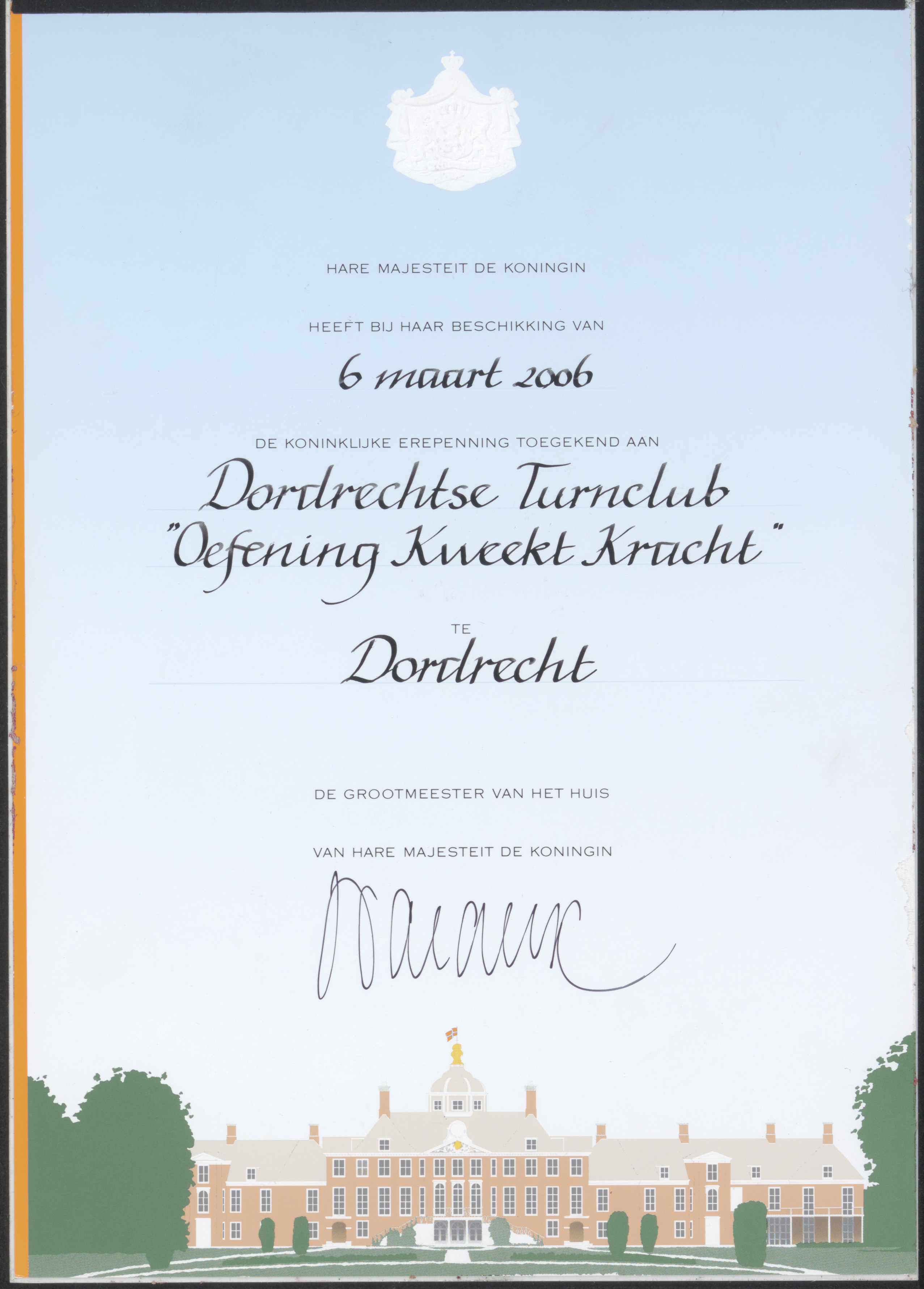 oorkonde Dordrechtse Turnclub Oefening Kweekt Kracht, Koninklijke erepenning, 6 maart 2006 (getekend Koningin Beatrix)