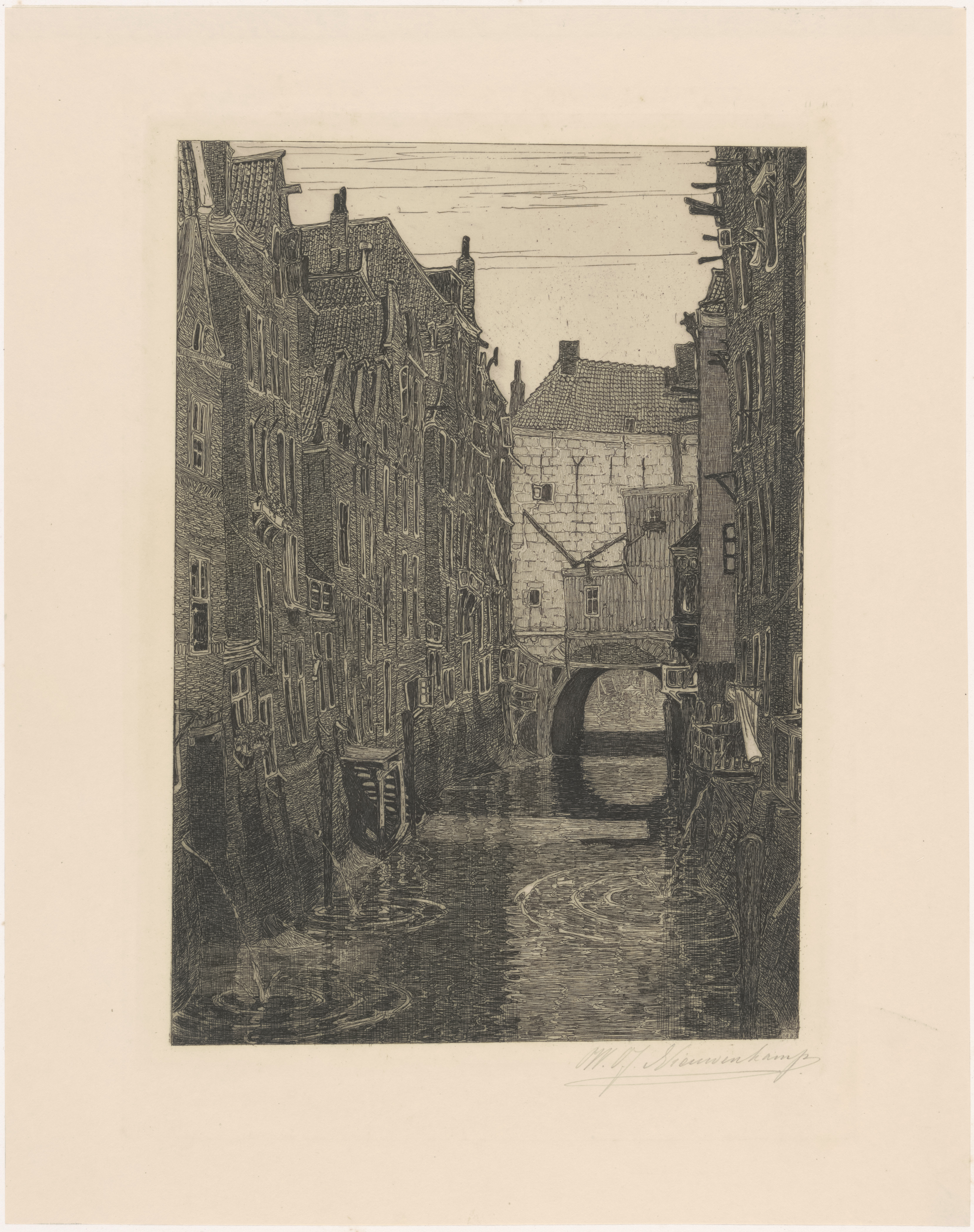 Tekening van de Voorstraatshaven richting Tolbrug. Links de Groenmarkt en rechts de …
