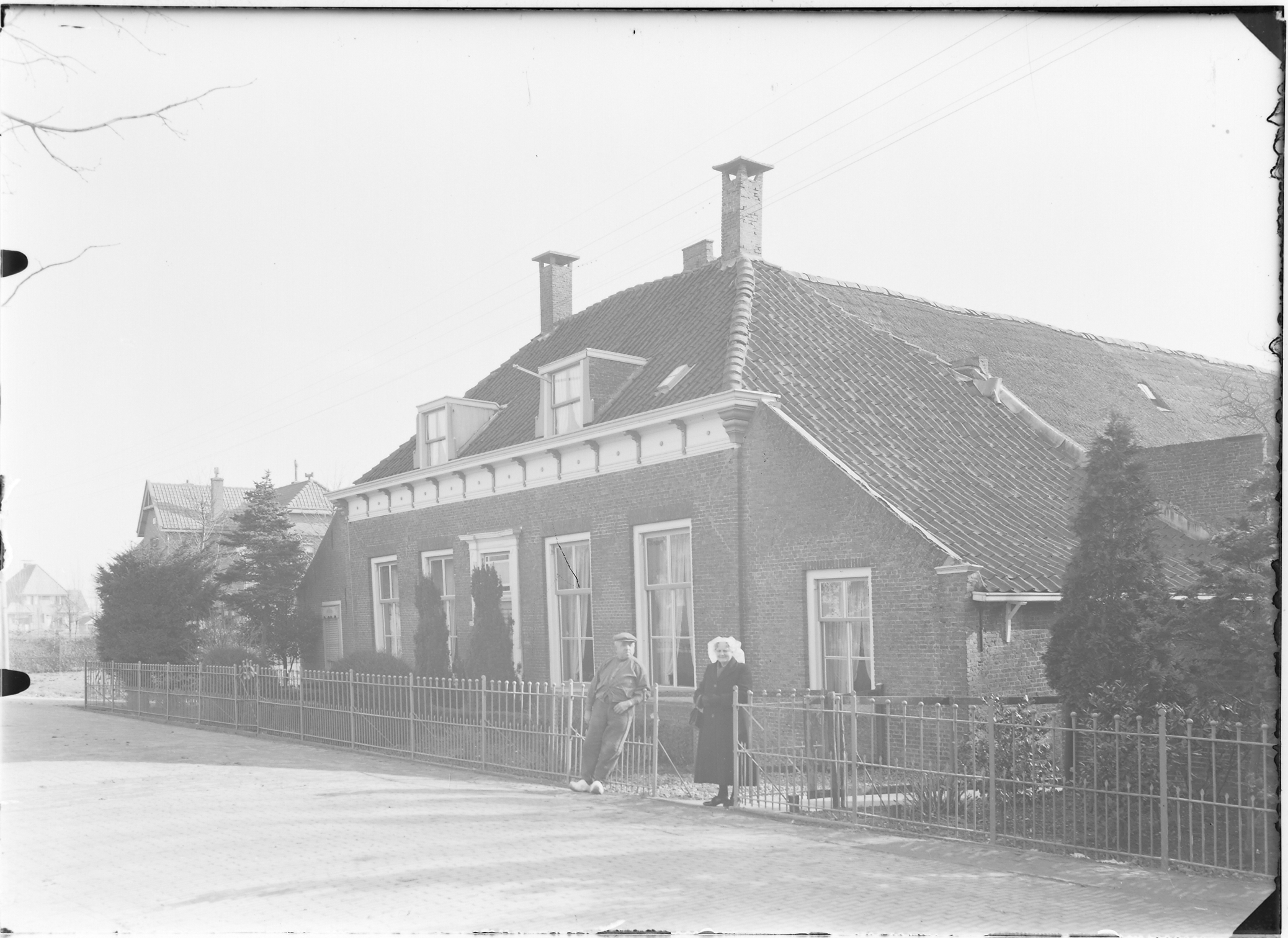 Boer en boerin, in klederdracht, voor hun boerderij in de Dorpsstraat in Heerjansdam