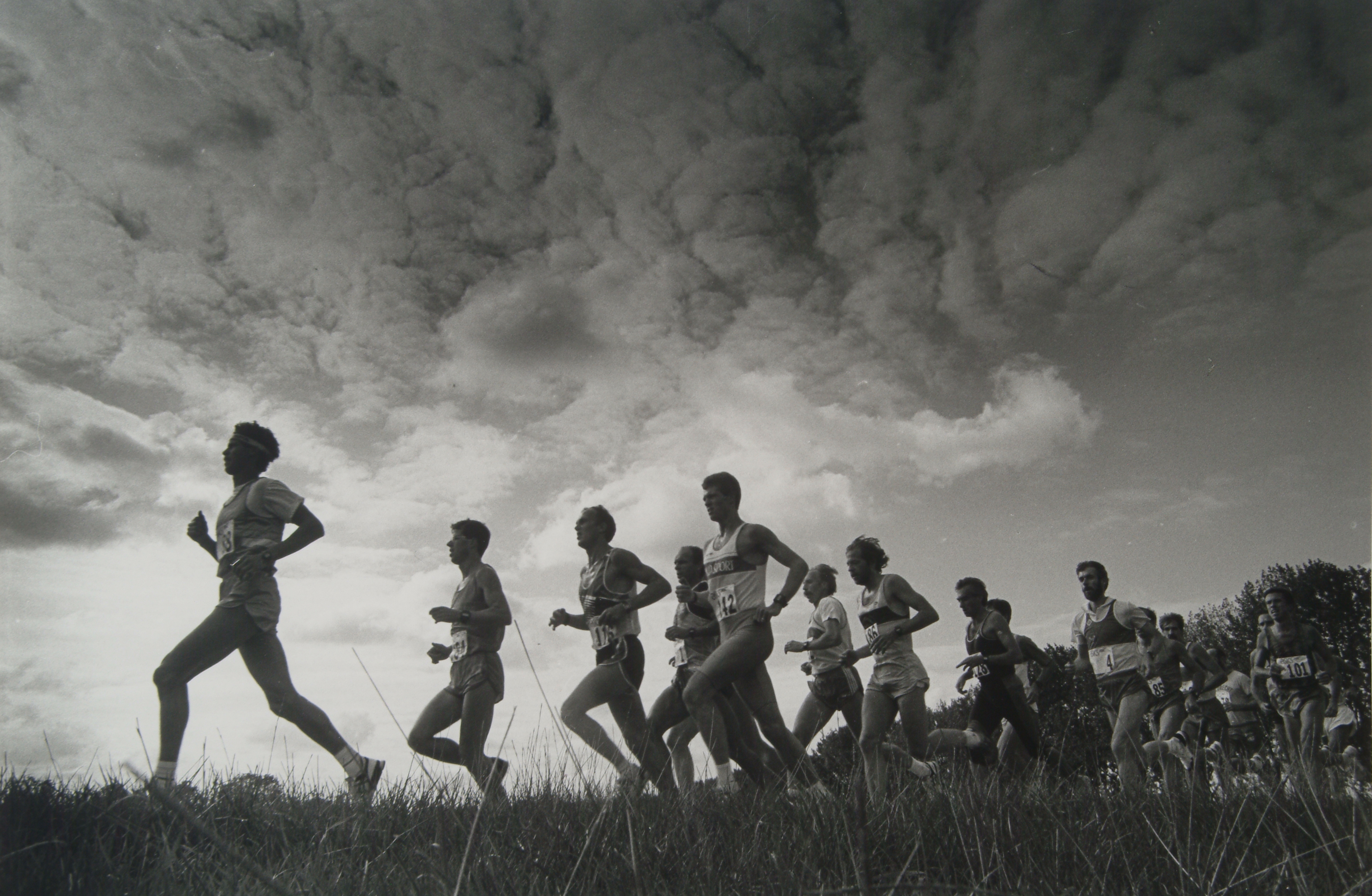 Een hardloopwedstrijd onder dreigende lucht ergens buiten op het Eiland van Dordrecht