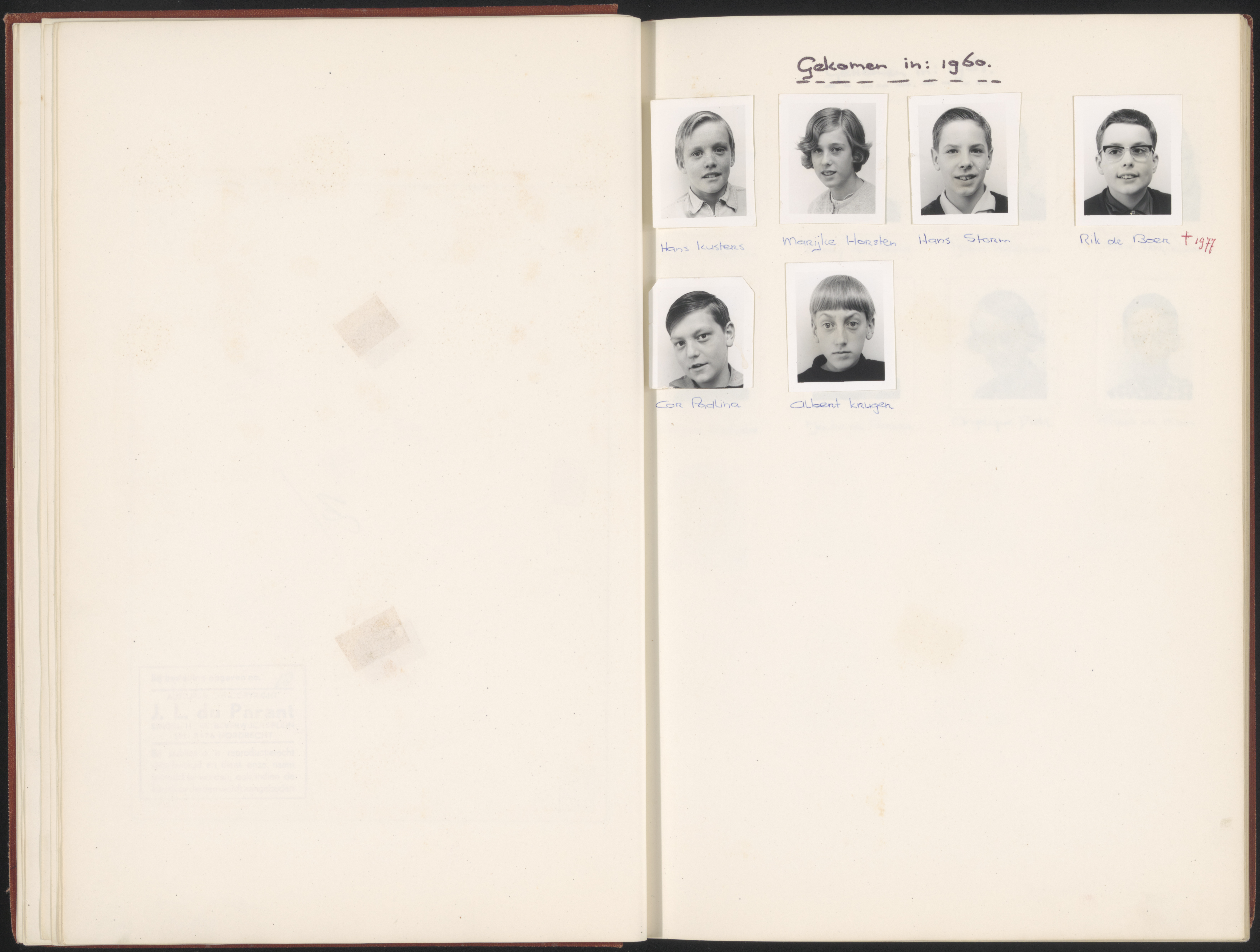 - Portretten van leerlingen van de Dordtse Buitenschool aan de Vrieseweg: Hans Kusters, Marijke Horsten, Hans Storm, Rik de Boer, Cor Padlina, Albert Kruger.