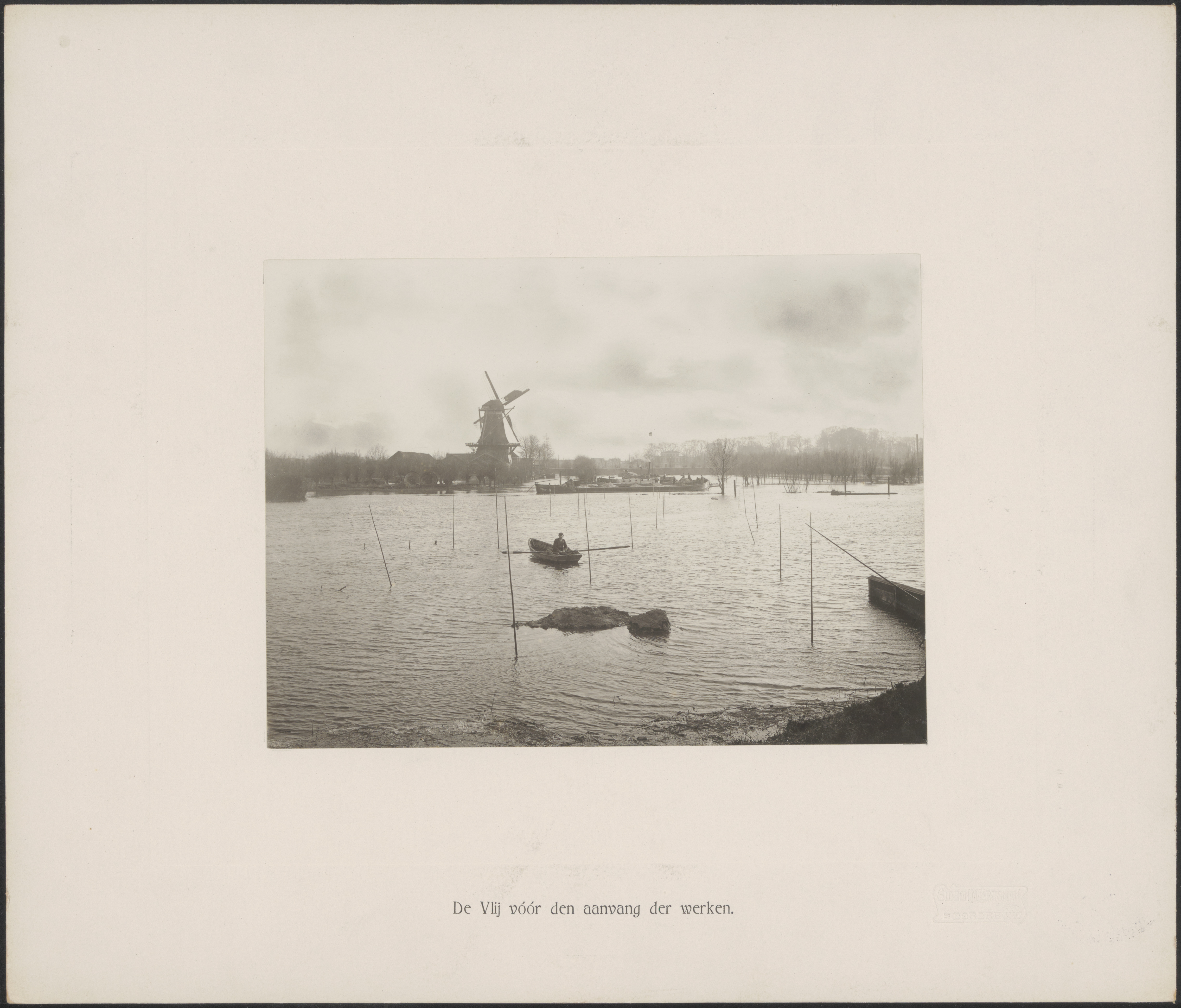 - De Vlij ten oosten van de Oranjelaan, gezien uit het noorden. Op de achtergrond molen De Nagtegaal op de hoek van de Noordendijk en de Oranjelaan.
