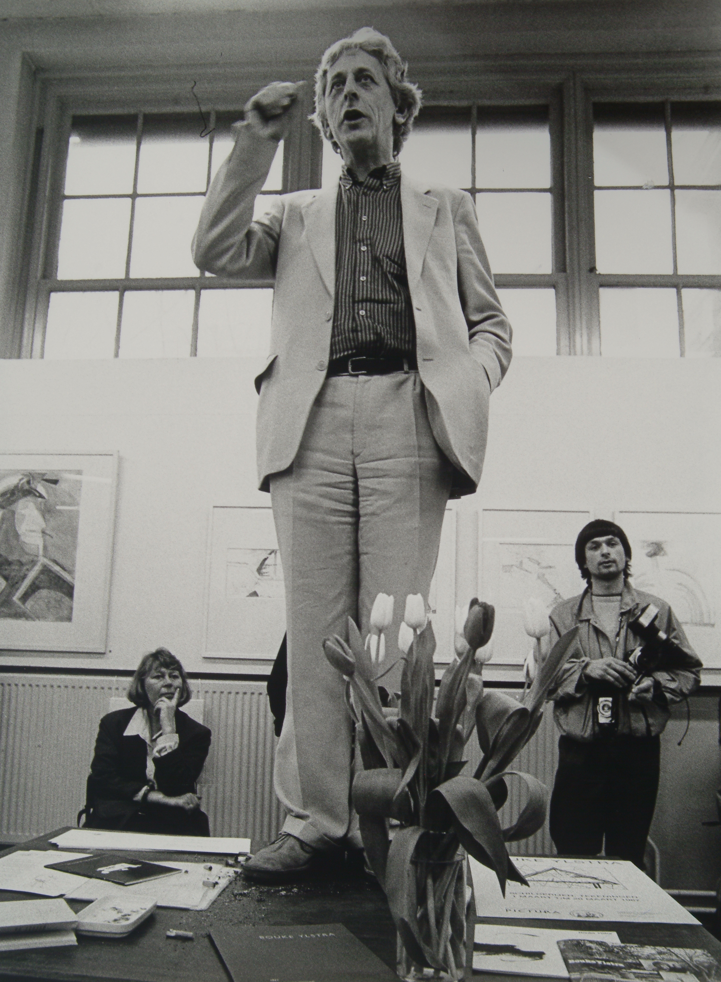 - Politicus Nico Lamers houdt staande op een tafel een toespraak bij de opening van een expositie van werken van Bouke Ylstra