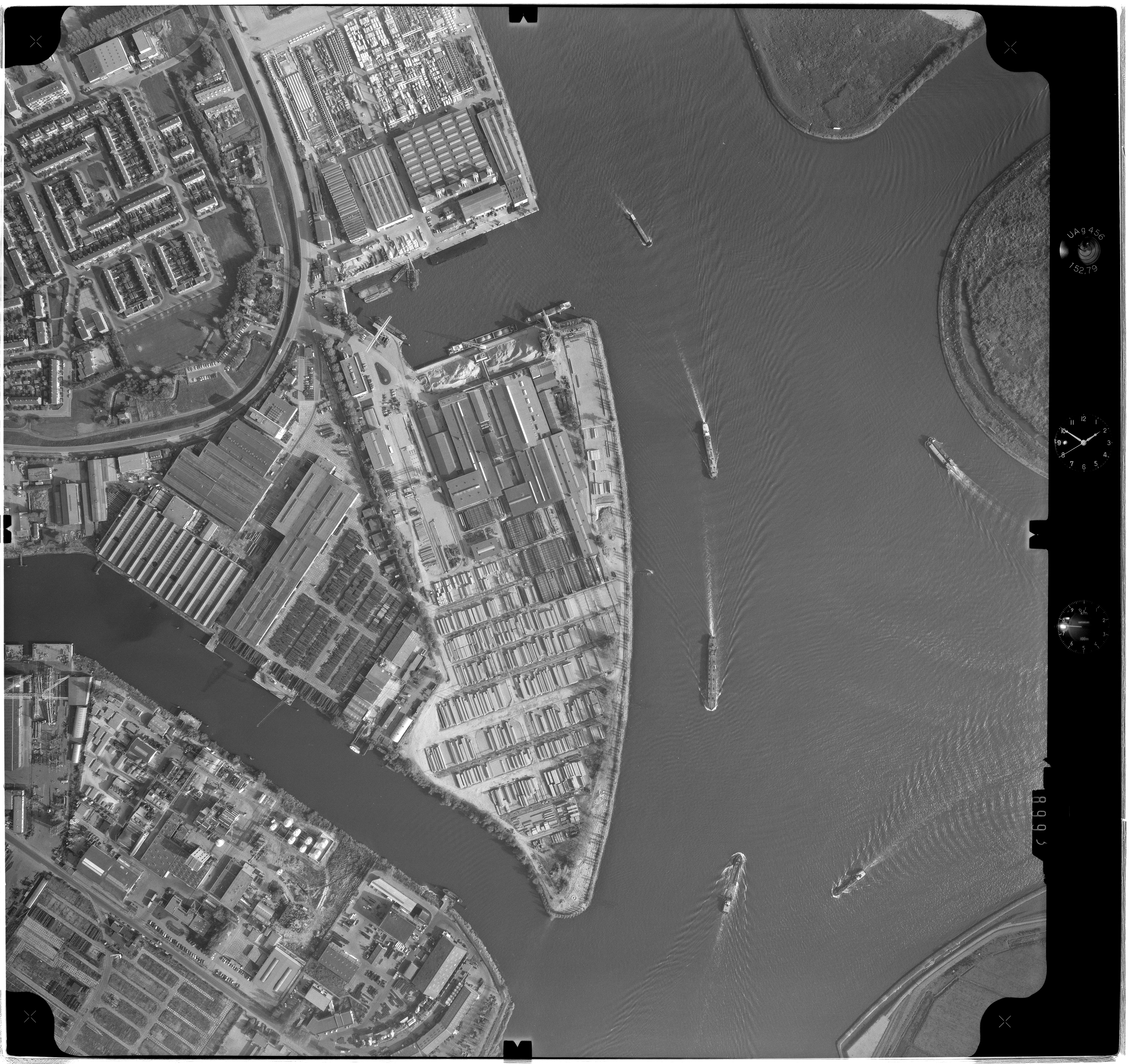 - Luchtfoto van de Oude Maas bij de Schokhaven en de Develhaven (onder) in Zwijndrecht.