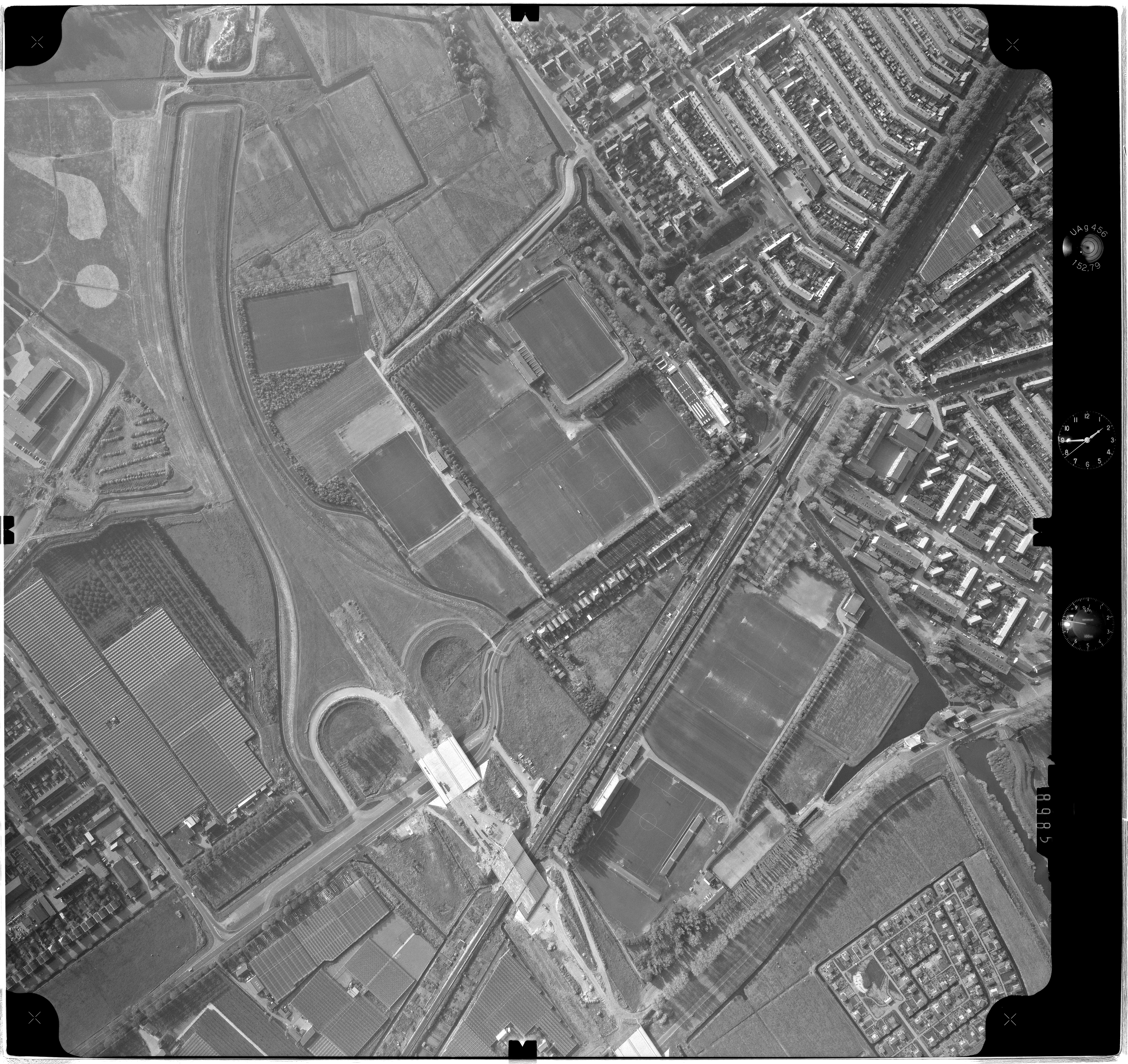 Links onder Provincialeweg. Midden voetbalveld FC. Dordrecht. Mid onder naar rechts boven spoorlijn Dordt Stadspolder.. Links boven fietstunnel Dordwijklaan in ontwikkeling. Rechts boven Land van Valk 1976