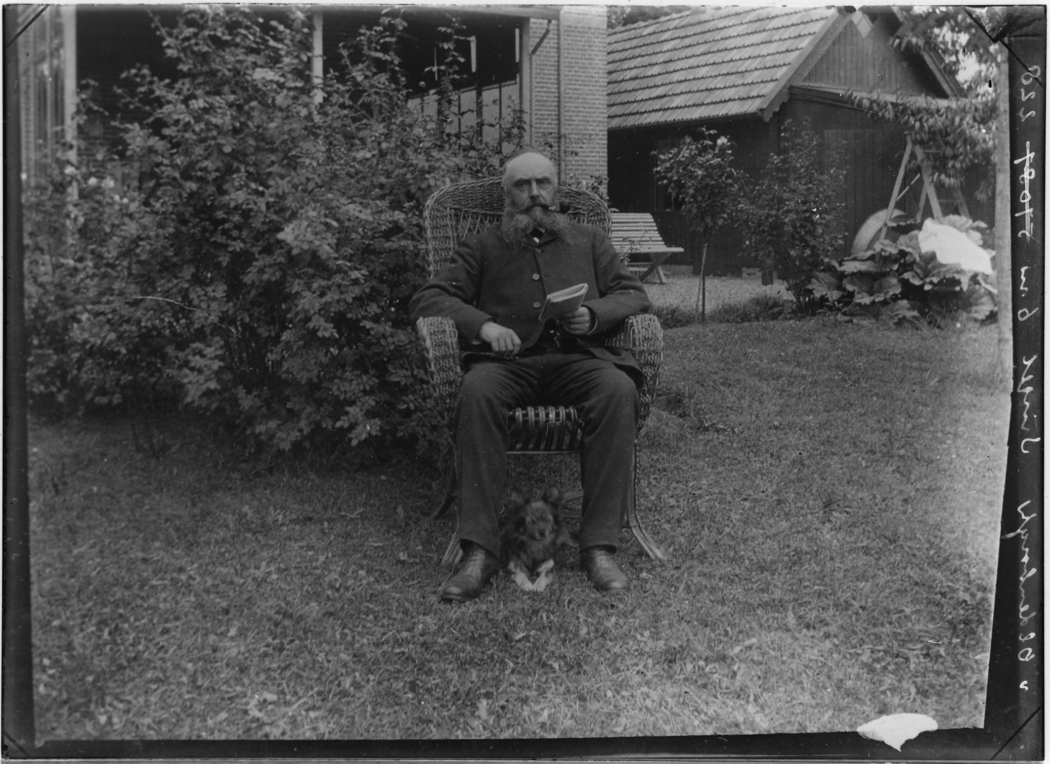 De heer J.F. van Oldenborgh Sr. met hond in zijn tuin aan de Singel 269 a rood