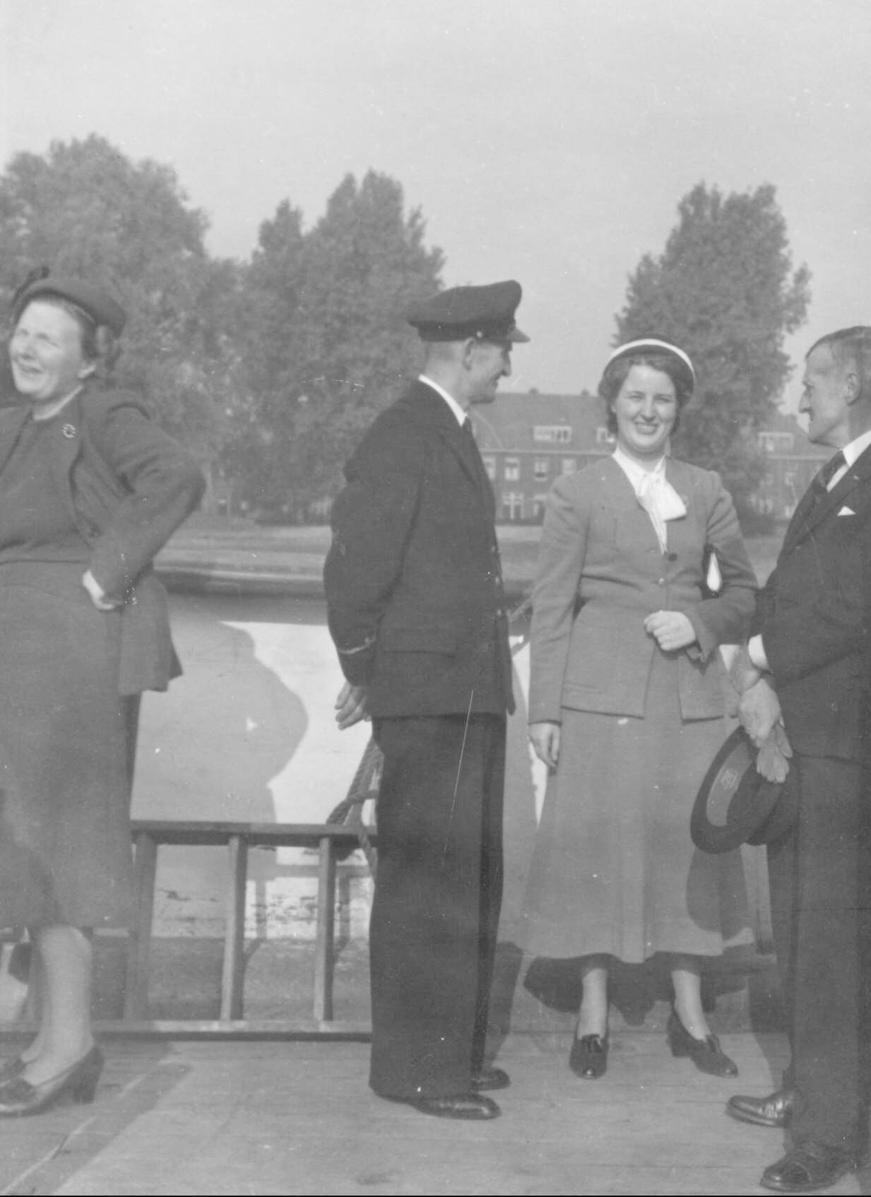 - H.M. Koningin Juliana bezoekt het opleidingsschip Hollands Glorie in het Wantij langs de Badweg nabij de Prins Hendrikbrug.
