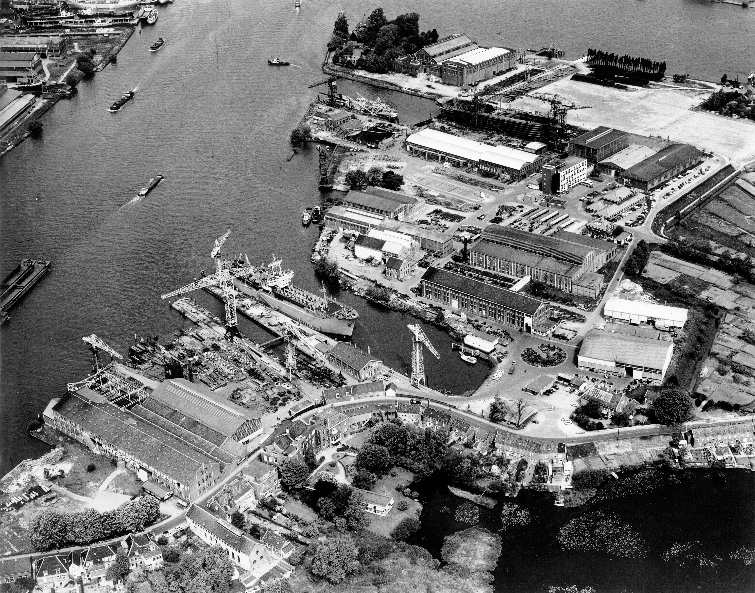 - Luchtfoto van scheepswerf Smit in Kinderdijk tussen de Noord (links), de Molenstraat (onder) en de Lek (rechtsboven).