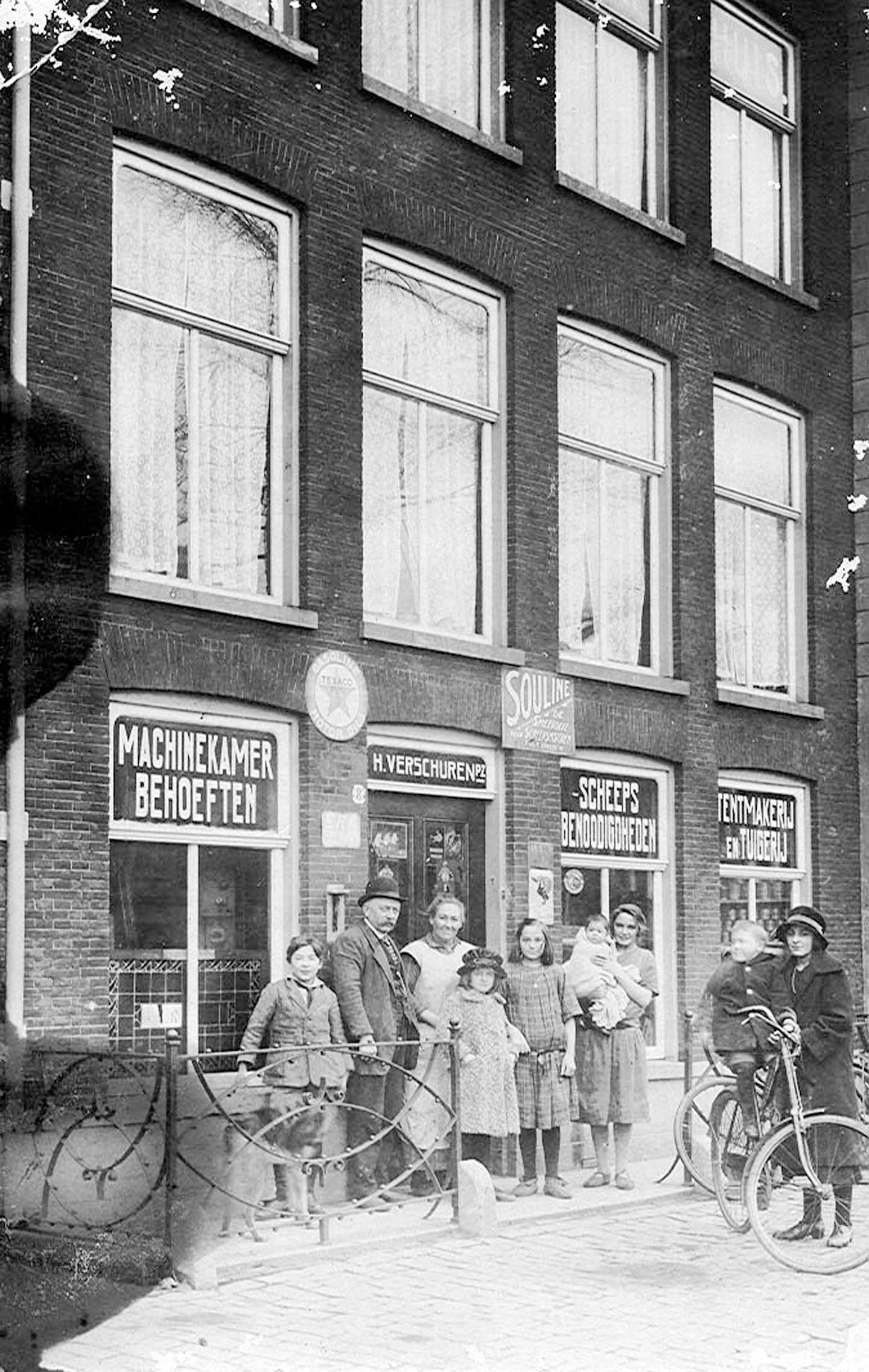 Poserende familie voor het pand van scheepsbenodigdheden H. Verschuren op de Kuipershaven.