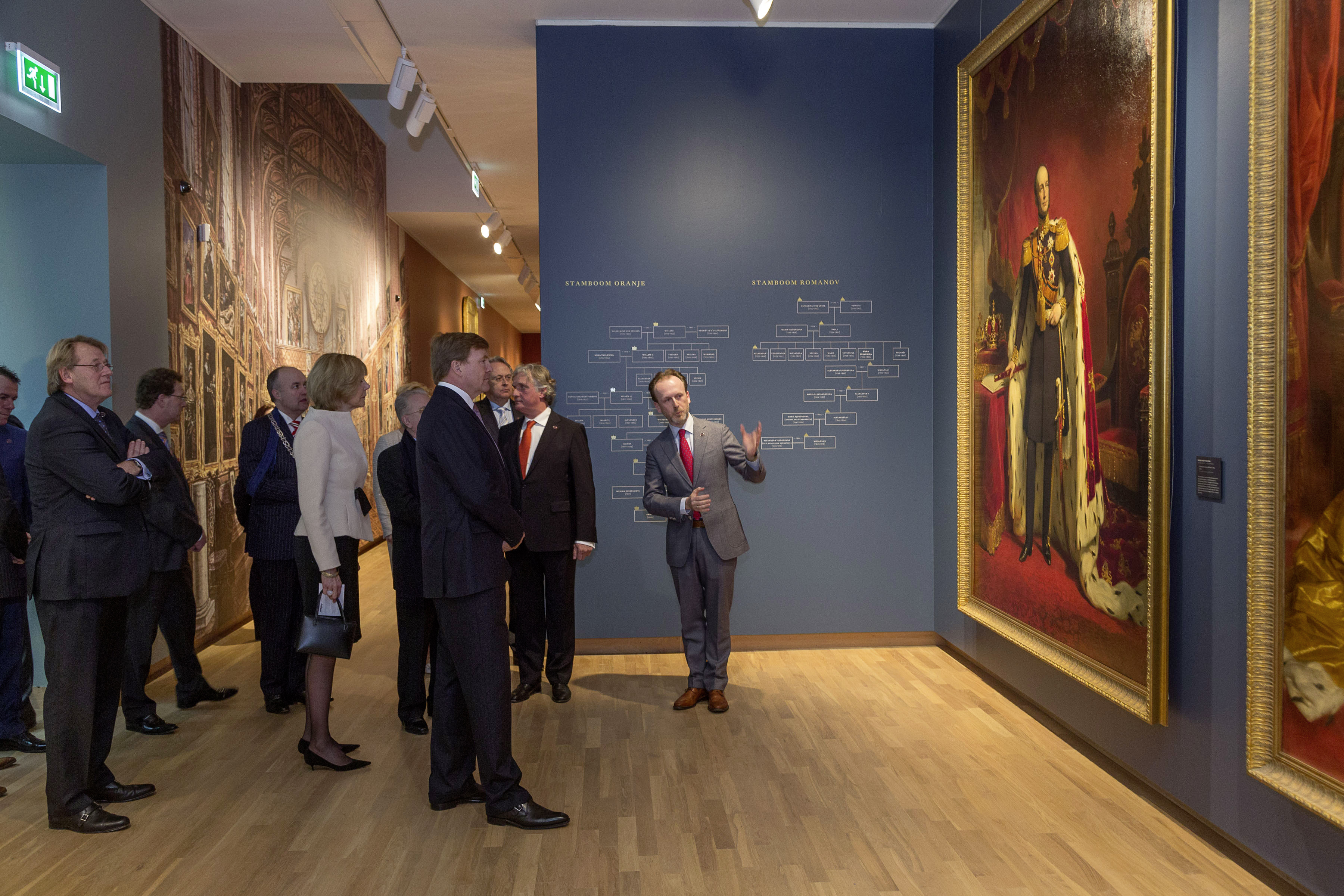 - Koning Willem-Alexander in het Dordrechts Museum op de tentoonstelling 'Kunstkoning Willem II'. Rechts van hem museumdirecteur Peter Schoon. De presentatie wordt gegeven door Sander Paarlberg, conservator oude kunst.