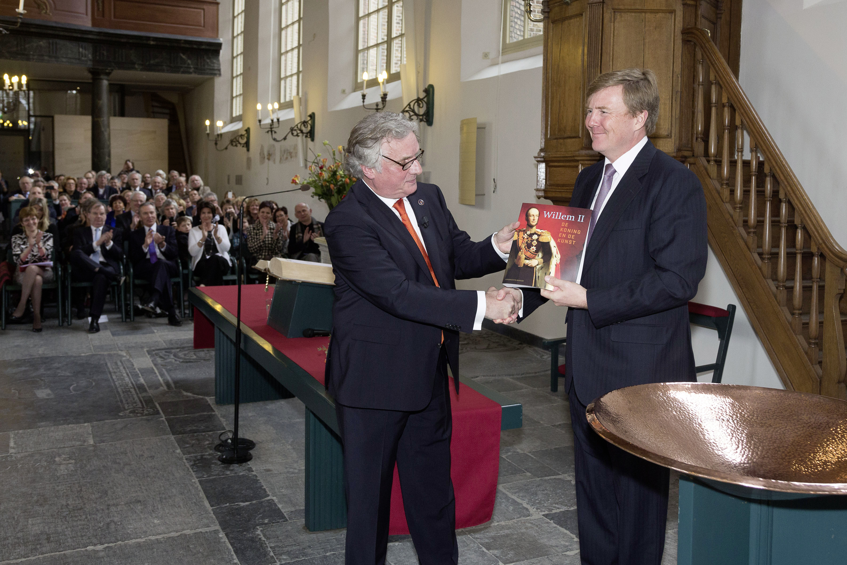 Koning Willem-Alexander ontvangt de catalogus van de tentoonstelling 'Willem II Kunstkoning' uit handen van directeur Peter Schoon van het Dordrechts Museum. Daarmee was de tentoonstelling, die in het Dordrechts Museum gehouden werd, geopend.