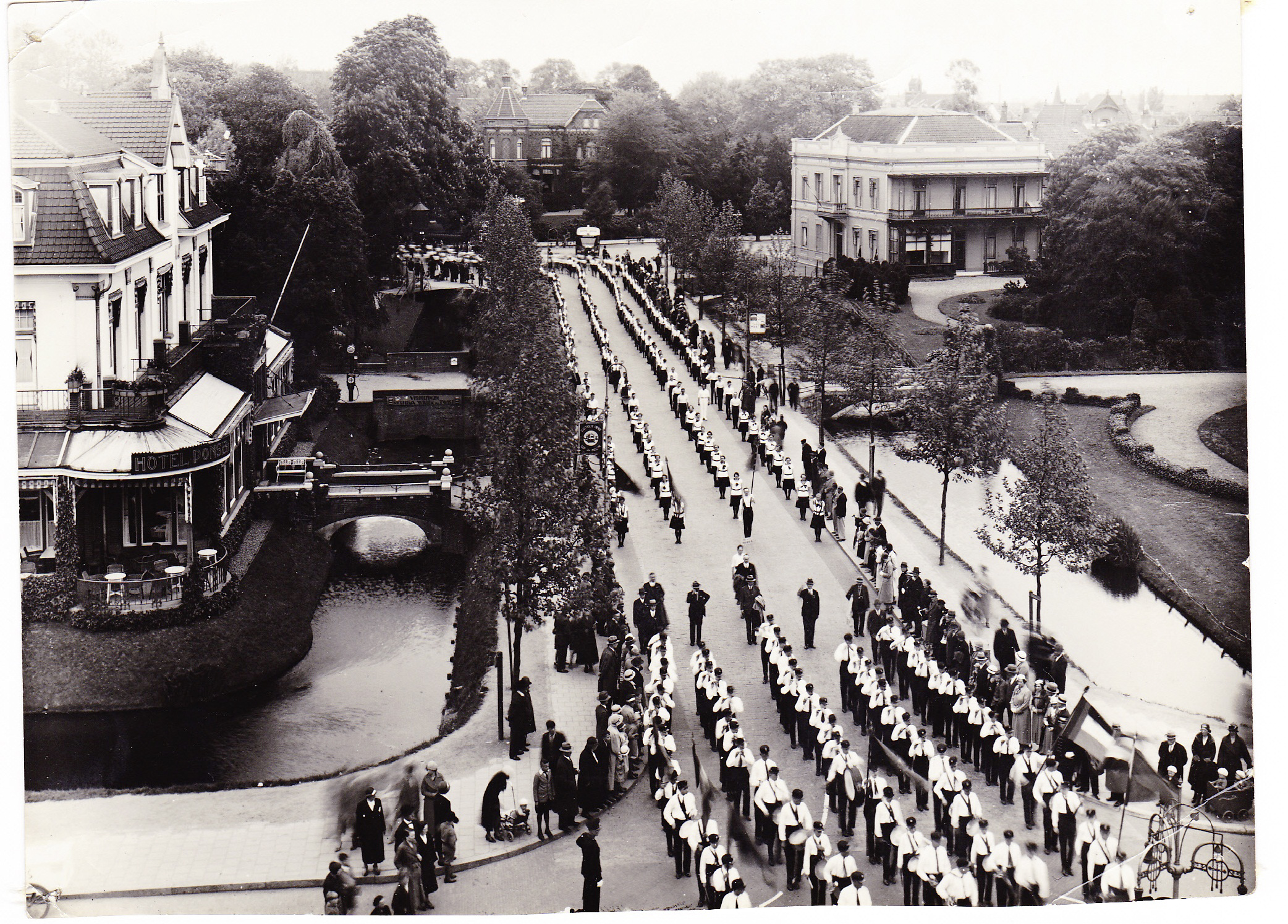 - Optocht met muziekkorps Jubal op de Stationsweg loopt richting station. Links hotel Ponsen, midden achter villa Maria en rechtsboven Huize Sint Anna.