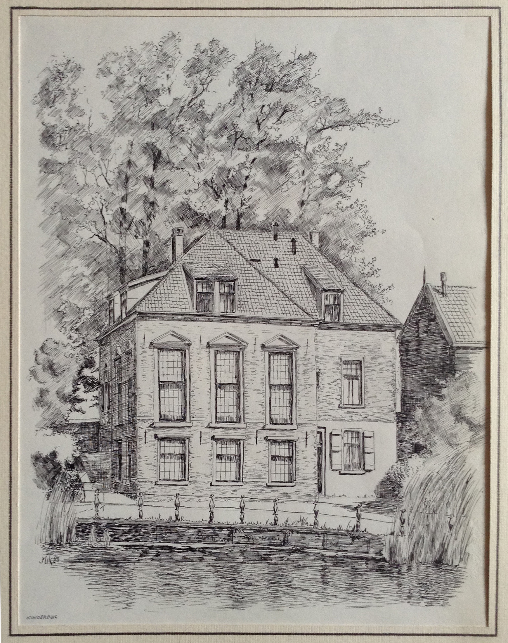 - Tekening van de achterkant van een monumentaal pand aan de Molenstraat in Kinderdijk.