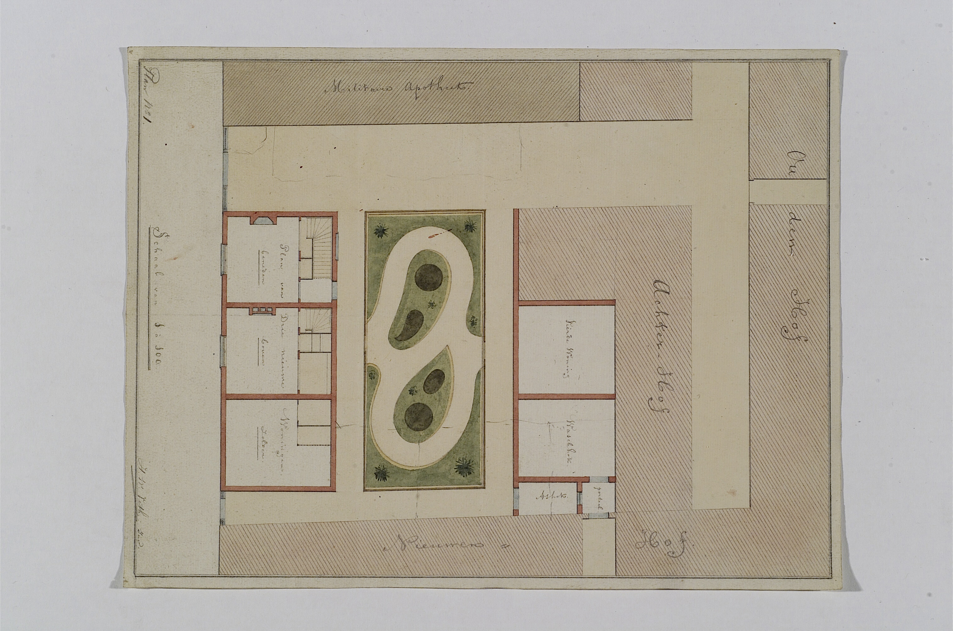 Lenghenhof --- tekening architect Huibert Willem Veth (1833-1909), met militaire apotheek, plan voor drie nieuwe woningen, vierde woning, waschhok, ashok (ouden hof-achterhof-nieuwe hof);