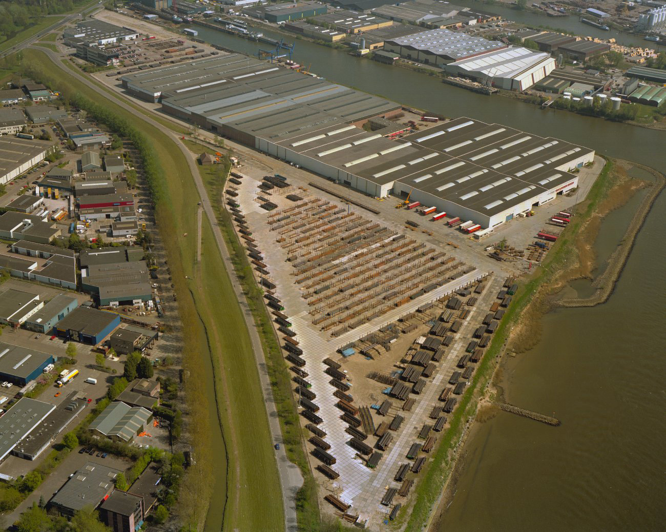 Luchtfoto van Van Leeuwen Buizen in Zwijndrecht. Rechtsboven de Drechthaven, daaronder …