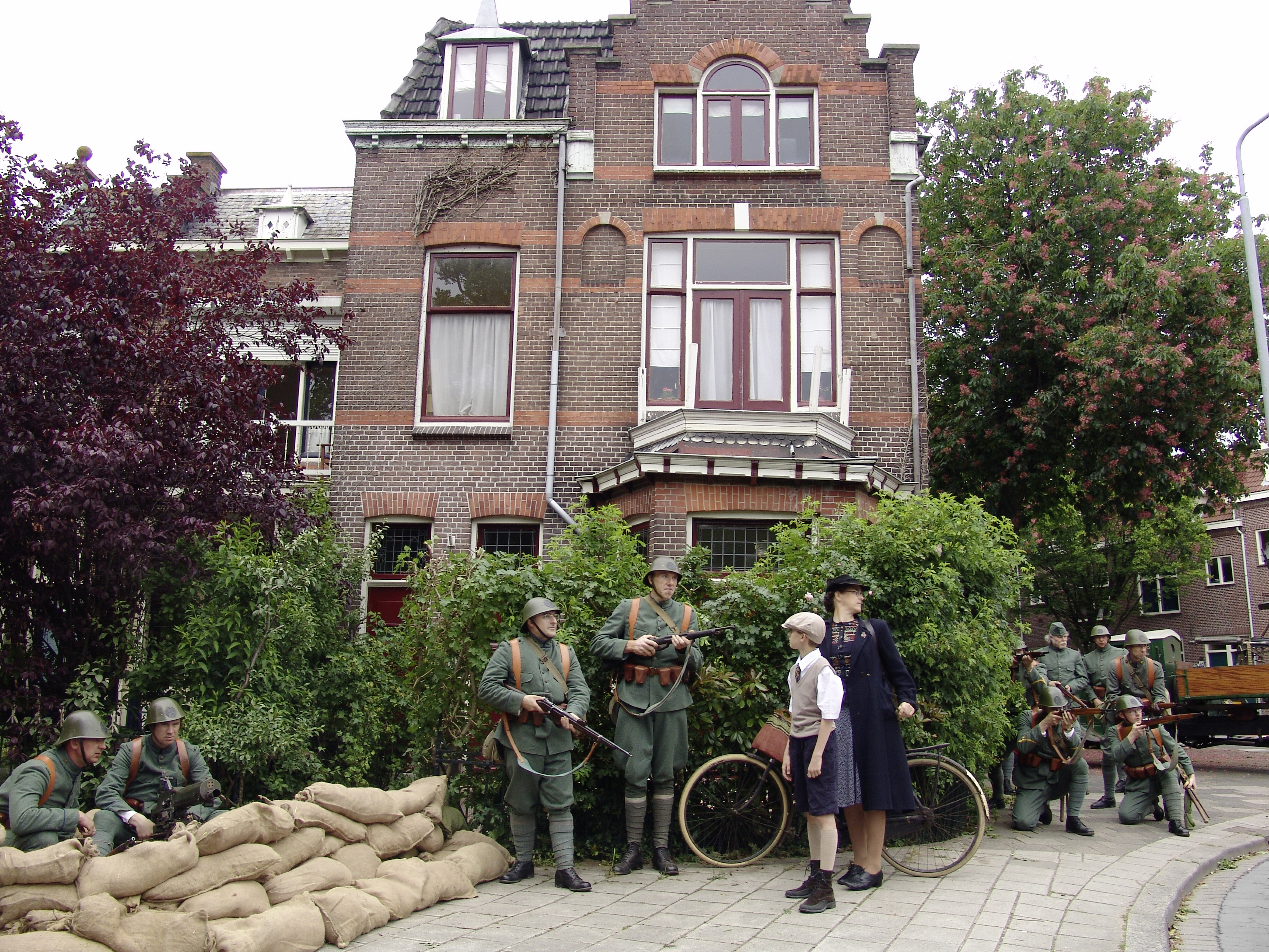 - Nagespeelde oorlogshandelingen in de eerste dagen van de Tweede Wereldoorlog, georganiseerd door het Comité Dordt Open Stad. Men staat op de hoek Willemstraat / Mariastraat; rechts op de achtergrond Dubbeldamseweg Zuid.