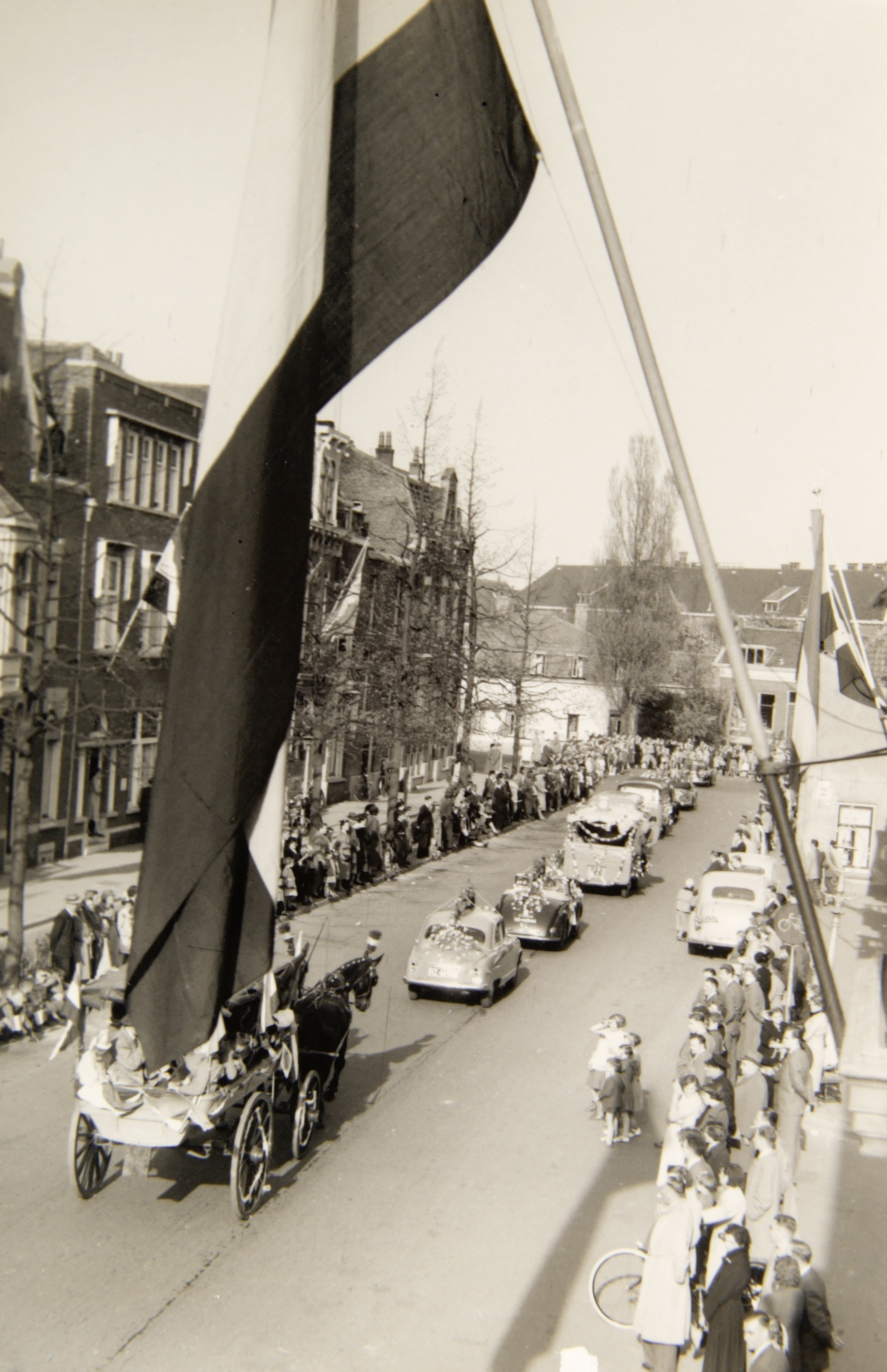 Een optocht met versierde Volkswagens rijdt op de Nicolaas Maessingel in de richting …
