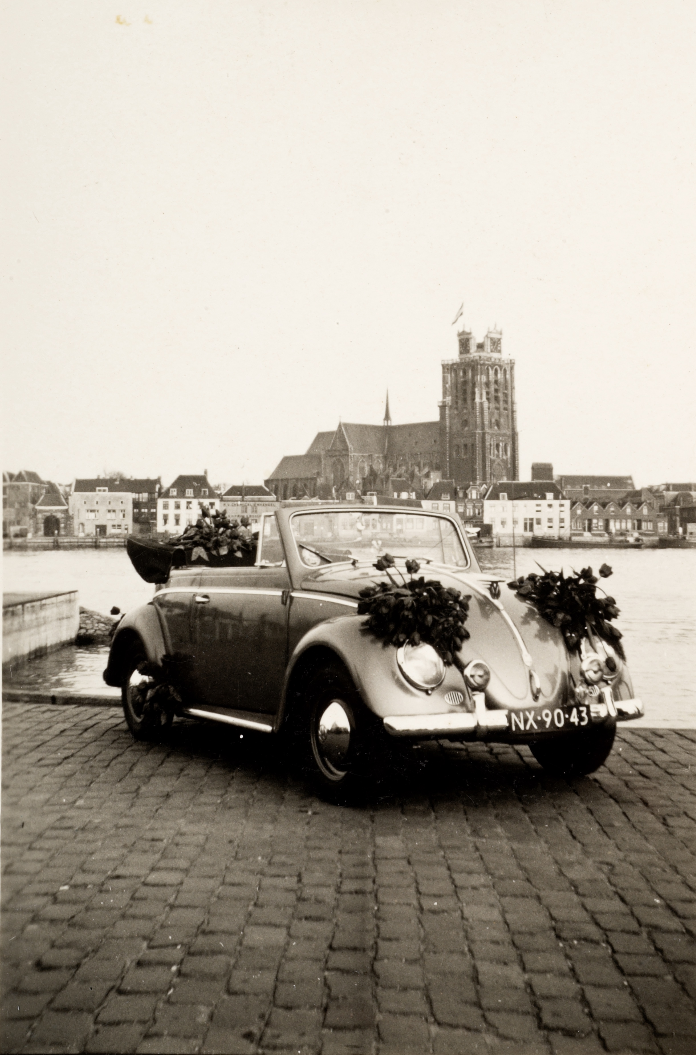 - Met bloemen getooide Volkswagen Kever op de Zwijndrechtse oever t.g.v. de opening van garage Ames op de Brouwersdijk.