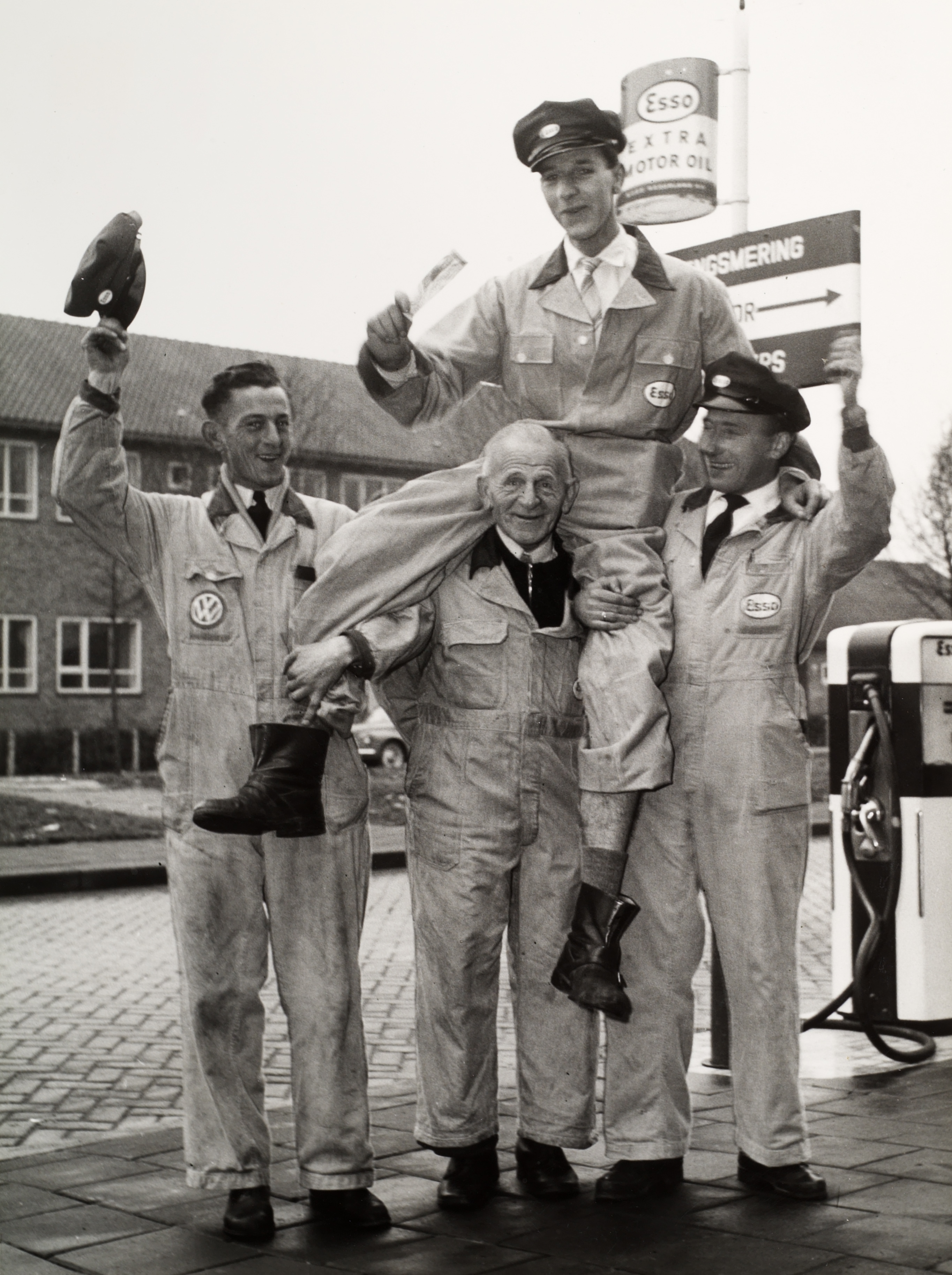 - Personeel van garage Ames aan de Brouwersdijk. De man op de schouders is Herman Bestenbreur.