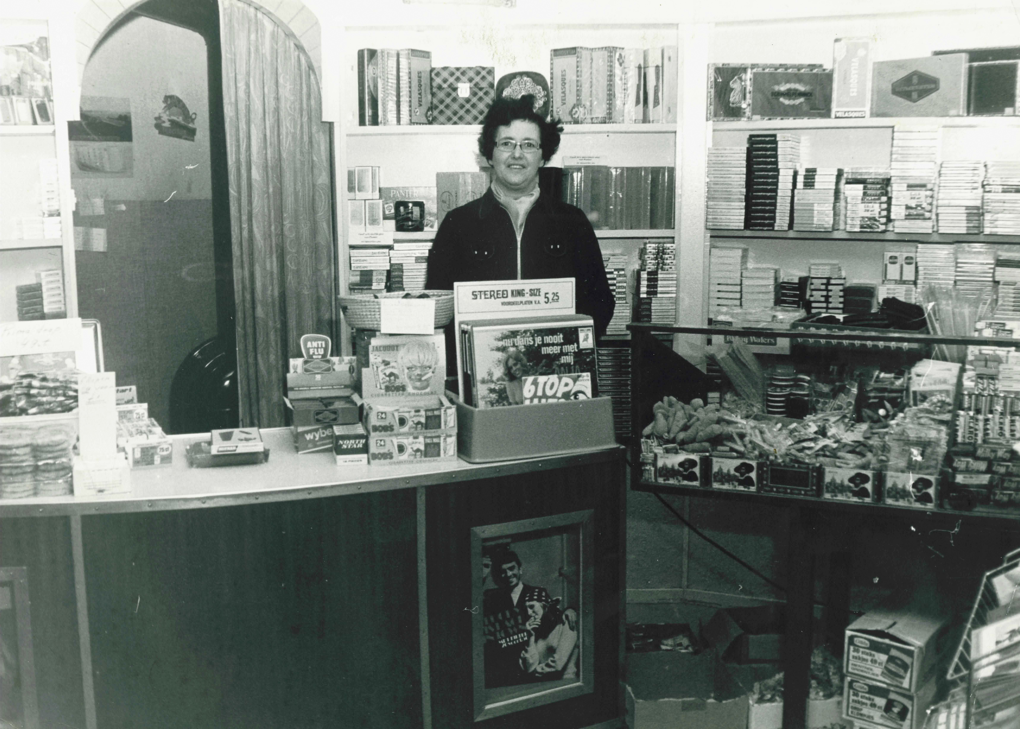 Leny Persoon in haar sigarenwinkel in de Mesdagstraat 41.