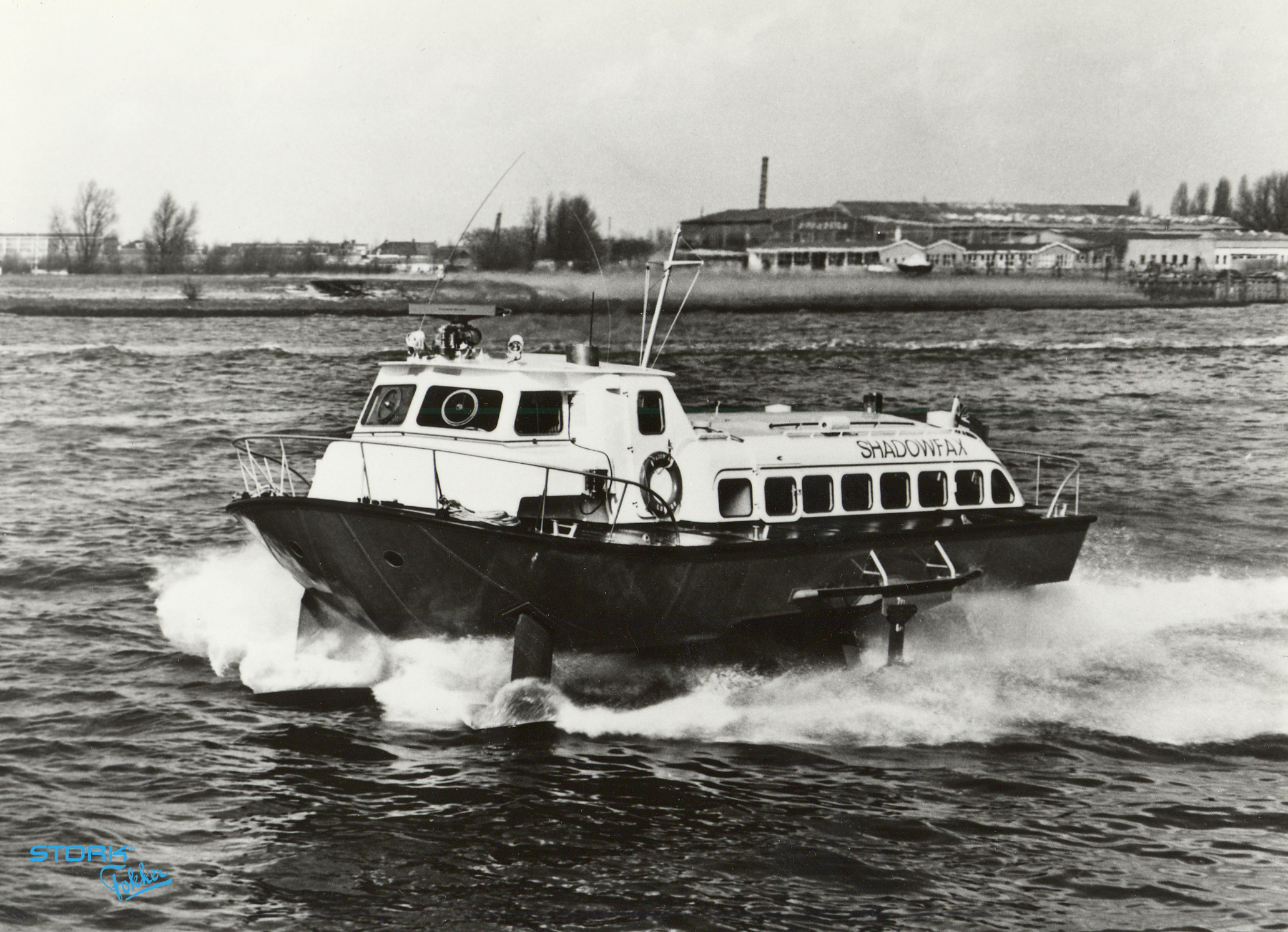 De bij Aviolanda in Papendrecht gebouwde draagvleugelboot Hydrofoil op de Beneden Merwede.