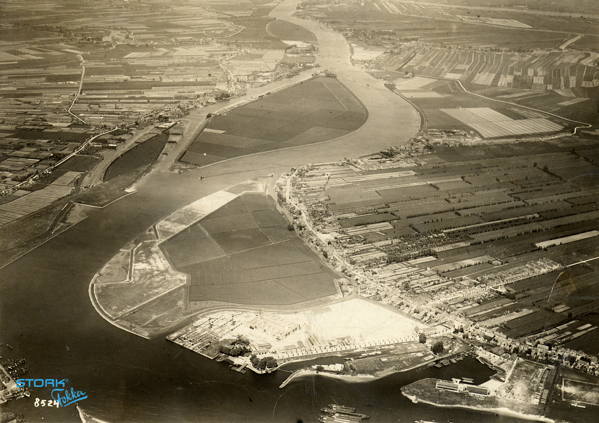 Luchtfoto van vliegtuigbouw Aviolanda (middenonder) in Papendrecht. Links de Noord en in het centrum de Sophiapolder.