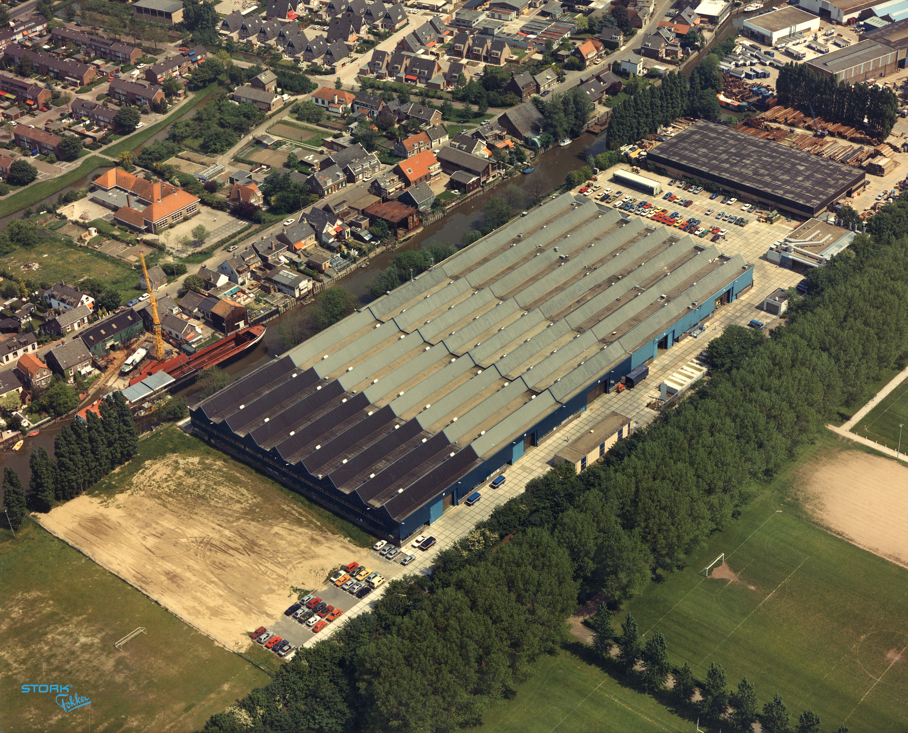 - Luchtfoto van vliegtuigfabriek Fokker tussen de Papendrechtse Geul en de Industrieweg in Papendrecht.