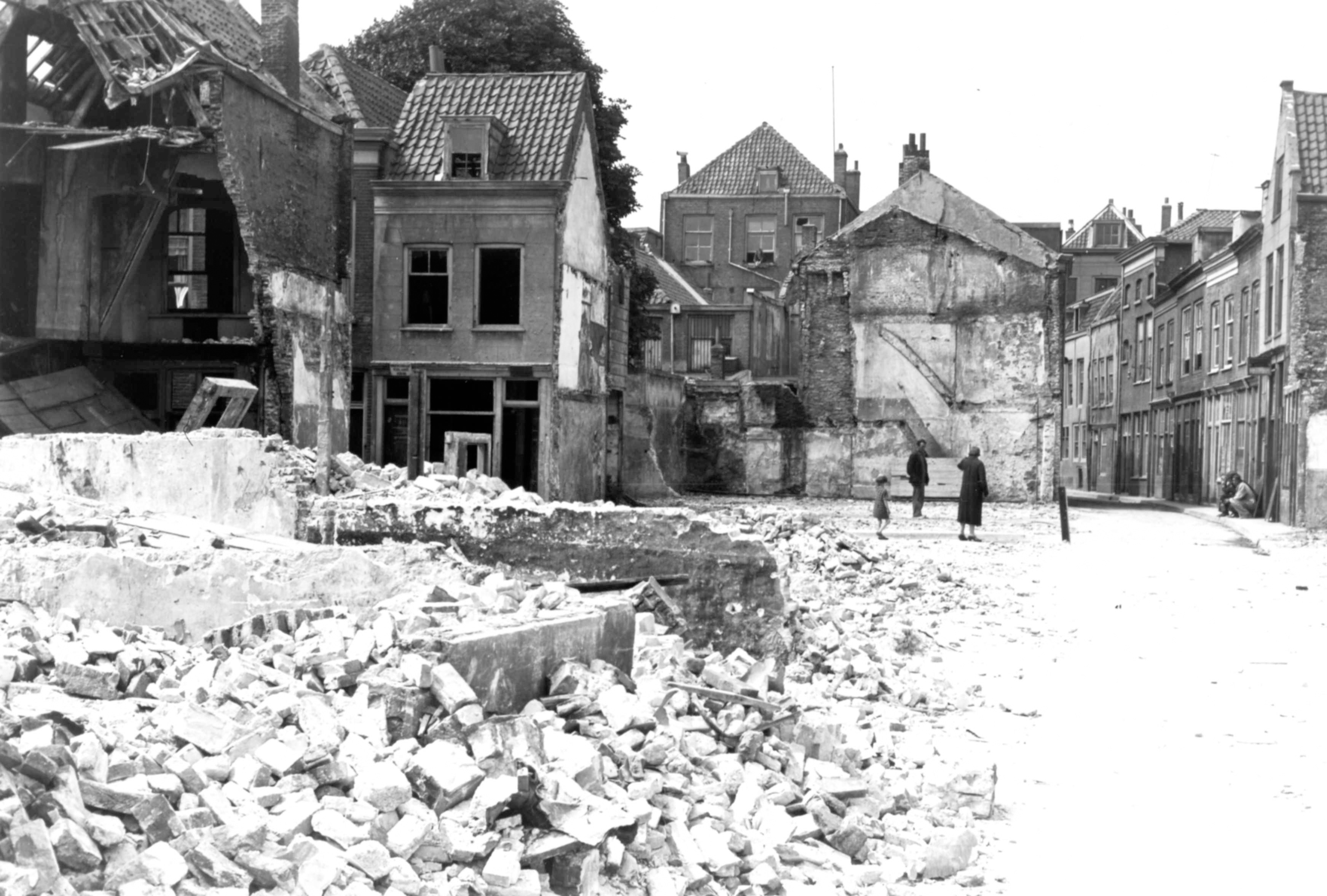 Afbreken van de Torenstraat, vanaf het Nieuwkerksplein richting Wijngaardstraat gezien.